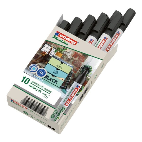 Markerstifte Universalmarker (inkl. OHP) Büroausstattung - EAN:4004764062850 - Stark auf jeder Oberfläche: edding 300 Permanentmarker schwarz 1,5 - 3,0 mm, 10 St.Die edding 300 Permanentmarker schwarz 1,5 - 3,0 mm, 10 St. bieten einen satten Farbauftrag sowohl auf glatten als auch rauen Untergründe und sind somit vielseitig verwendbar. Mit diesem beliebten Produkt können Sie fast alle Materialien dauerhaft beschriften.Wasserfest und permanentDa die Tinte wasserfest ist, können Sie mit den Markern auch Oberflächen beschreiben, die Feuchtigkeit ausgesetzt sind, ohne dass die Farbe verwischt oder entfernt werden kann.LichtresistentDie Farbe ist lichtbeständig, daher bleibt sie auch nach langer Zeit bestehen.Schnell trocknendDank der schnell trocknenden Tinte passiert ein versehentliches Verschmieren nicht so schnell. Linkshänder haben dadurch deutliche Vorteile.Gut für empfindliche NasenDank der geruchsarmen Tinte brauchen Sie keine Kopfschmerzen, Übelkeit oder Irritation der Atemwege zu befürchten. Diese werden meist durch stark riechende Lösungsmittel verursacht. Der Hersteller empfiehlt die Anwendung für fast alle Materialien wie Holz, Metall, Glas, Plastik oder Karton.Benutzerfreundlicher Griff und markante FarbeFür Ihre Projekte bekommen Sie die Farbe Schwarz. Mit dieser ansprechenden und beliebten Farbe macht es besonders Spaß. Durch die runde Griffzone schreibt es sich mit den edding Permanentmarkern 300 äußerst angenehm und ein variables Halten ist möglich.Welche ... Das 10er-Pack Permanent-Marker »22 EcoLine« ist eine nachhaltige Wahl, da die Marker aus recycelten Materialien bestehen. ![]() Edding 10er-Pack Permanent-Marker »22 EcoLine« schwarz