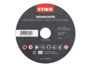 Schleifen Polieren Wohnen Haus Garten Heimwerken Elektrowerkzeuge - - Eigenschaften: STIER Trennscheibe Edelstahl 125 x 1,0 x 22,23 mm Form 41 Einsatzbereich Hauptanwendung: für den Einsatz auf Edelstahl / VA-Stahl, Inox, z.B. 1.4301 (X5CrNi18-10 oder 304) Einsatzbereich Nebenanwendung: Trennscheibe für andere Metalle wie Schwarzstahl, Baustahl, St37, S235JR, 1.0037 oder Karbonstahl genannt sowie Stahlguss abgestimmt. Aufbau und Herstellung: Aus hochwertigem Korund (Aluminiumoxid) und 2 vollflächige Glasfasergeweben hergestellt. Die Mindestseitenlast beträgt nach EN 12413 und oSa 40 N. Das Verfallsdatum befindet sich auf dem Bohrungsring. Trennscheiben mit gerader Form ermöglichen eine größere Eintauchtiefe und somit auch mehr Schnitte und eine längere Standzeit Sehr gut geeignet für das Trennen von rostbeständigem und säurebeständigem Stahl, Kabelschächten, Trägern, Baustahl, dünnwandigen Blechen und Profilen Branchen: perfekte Eignung im Anlagenbau und Montage, im Kessel- und Behälterbau, im Containerbau, im Konstruktionsstahlbau und im Rohrleitungsbau. Spezifikationen: A 46 T BF Maße: 125 x 1,0 mm mit M14/22,23 mm Bohrung. Gekröpft. Geringe Gratbildung Geringer Funkenflug Hohe Schnittgeschwindigkeit Hohe Lebensdauer Kühler Schnitt Geringe Geruchsentwicklung Die Flexscheibe ist auch für Winkelschleifer 125 mm geeignet Durch die geringe Dicke auch für Akku Winkelschleifer geeignet Die 125mm Trennscheibe Metall bitte nur auf 125 mm Winkelschleifer / Metall Trennschleifer ... ![]() ![]() Trennscheibe 125mm - 5x INOX eBay Flexscheibe Trennscheibe Metall Edelstahl
