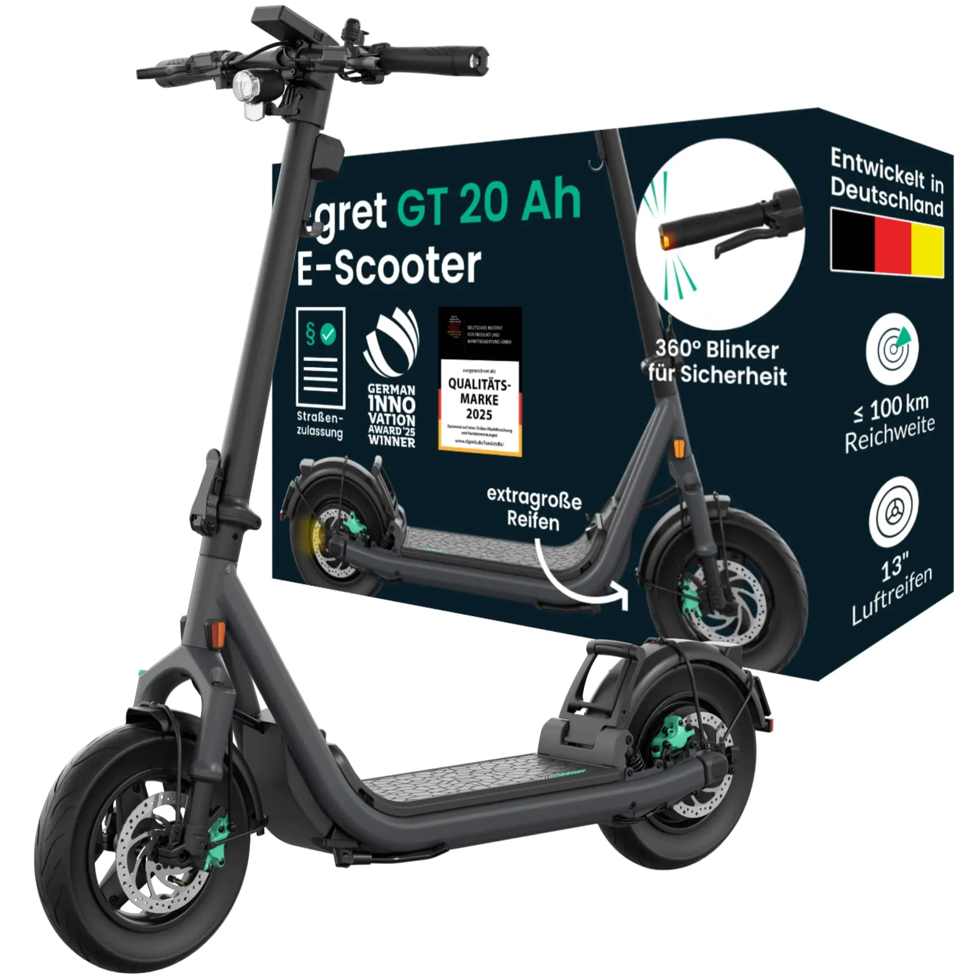 Verfügbarkeit: 2-4 Werktage - Kategorie: E-Scooter - Egret - GTIN:4260710548643 - Egret GT €“ Der Premium E-Scooter für maximale Leistung und Komfort!š¡ Kraftvoller 500 W Motor (1.620 W Peakleistung, 62 Nm Drehmoment)🔋 Schnellwechsel-Akkusystem mit bis zu 100 km Reichweite🛞 13€ Luftreifen & Vollfederung für höchsten Fahrkomfort🔒 Elektronische Wegfahrsperre & €žApple Find My€œ-Funktion📱 Hightech-Cockpit mit 3,5€ Farbdisplay & NFC-TechnologieEin neuer Maßstab für E-ScooterDer Egret GT kombiniert modernste Technologie mit höchster Performance. Entwickelt von deutschen Ingenieuren, bietet er ein unschlagbares Gesamtpaket aus Sicherheit, Komfort und Power €“ perfekt für den urbanen Alltag und darüber hinaus.Mehr Reichweite, mehr FreiheitDank des Schnellwechsel-Akkusystems hast du die Wahl zwischen einem 15 Ah Akku (bis zu 75 km) und einem 20 Ah Akku (bis zu 100 km). So kannst du selbst lange Strecken problemlos bewältigen, ohne ständig nachladen zu müssen.Fahrkomfort auf jedem Untergrund🛞 13€ Luftreifen mit Pannenschutz für Laufruhe & Stabilität🛠Einstellbare Upside-Down Federgabel & Gewindefahrwerk für maximalen Fahrkomfort💨 500 W Motor mit 1.620 W Spitzenleistung für starke BeschleunigungIntelligente Sicherheitsfunktionen🔦 80 Lux OSRAM LED-Frontlicht mit Tagfahrlicht-Funktion🚦 Integrierte Blinker vorne & hinten für maximale Sichtbarkeit🔒 Elektronische Wegfahrsperre ... ![]() ![]() Egret GT Serie E-Scooter mit Straßenzulassung | Bis zu 100 km Reichweite & 20 km/h, 13" Luftreifen, RST Federgabel, OSRAM LED, Hydraulische Bremsen, NFC & Apple Find My, bis 150 kg Traglast (GT 20 Ah)