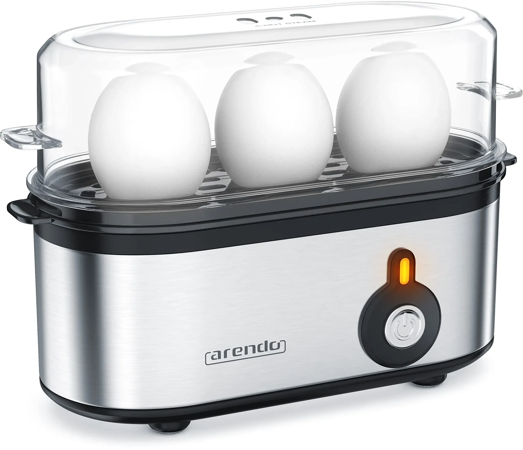 Verfügbarkeit: Auf Lager - Kategorie: Eierkocher - Arendo - GTIN:4061474009773 - Modellbezeichnung: Arendo Threecook Edelstahl Eierkocher | Ideal für Singlehaushalte oder kleine Familien: Kreieren Sie mithilfe des individuell anpassbaren Härtegrades (weich/mittel/hart) Ihr perfektes Frühstücksei (bis zu 3 Eier). GS - Geprüfte Sicherheit! | | 303093 Verwendung: Starten Sie perfekt in den Tag! Mit dem Arendo Threecook Edelstahl Eierkocher machen Sie absolut nichts falsch. Wenn Sie mehr als 3 Eier kochen möchten, empfehlen wir Ihnen unsere beiden Verkaufsschlager Sevencook (bis zu 7 Eier) ASIN: B01M32PAPK oder Sixcook (bis zu 6 Eier) ASIN: B01INIVPDG von Arendo. Perfektes Frühstück: Der leistungsstarke 210W Eierkocher von der Haushaltsqualitätsmarke Arendo zeichnet sich durch ein zeitloses und zugleich modernes Edelstahl-Design mit schwarzen Kunststoffapplikationen aus. Außerdem lässt sich der Härtegrad der zu kochenden Eier individuell in den Stufen weich, mittel und hart auswählen. Dazu erinnert ein akustisches Signal Sie daran, wann das Kochen der Eier abgeschlossen ist und Sie die Eier abschrecken können. Platzsparender Eierkocher: Der Arendo Threecook Edelstahl-Eierkocher ist in Bezug auf die Geräte-Abmessungen äußerst kompakt, sodass er sich vor allem für diejenigen eignet, die in der Küche nur über wenig Platz verfügen. Abmessungen: ca. 135mm x 205mm x 85mm (HxBxT) | Kabellänge: ca. 0,75m | Kabeldurchmesser: 6mm | Gewicht: ... Dieser Eierkocher von Korona ist ein vielseitiges 2-in-1 Gerät, das sowohl als Eierkocher für bis zu 16 Eier als auch als Mini-Dampfgarer für Gemüse genutzt werden kann. ![]() ![]() Korona 25303 Edelstahl Mini Dampfgarer und Eierkocher | Kleiner Dämpfer für Gemüse | Profi Kocher für bis zu 16 Eier