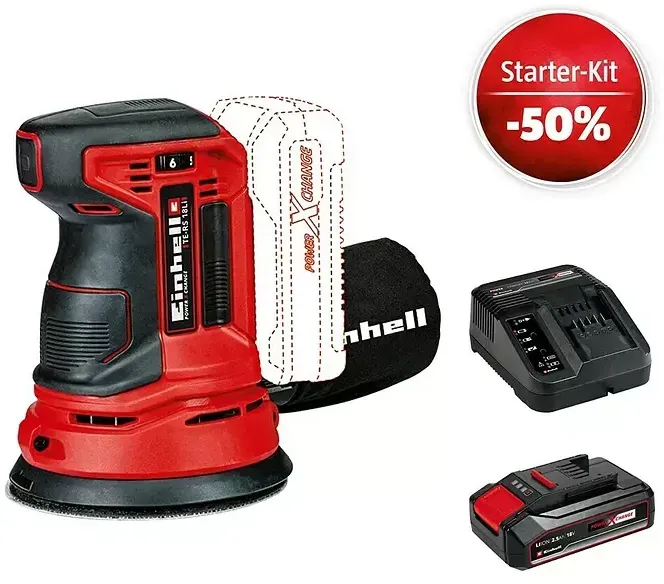 Kategorie: Exzenterschleifer - Einhell - GTIN:4006825618341 - Akku-Exzenterschleifer: Einhell TE-RS 18 Li Solo Eigenschaften: Fester Halt des Schleifpapiers durch KletthaftungDrehzahl-ElektronikAngenehmes Arbeiten dank Softgrip Integrierte StaubabsaugungAnschluss für externe StaubabsaugungSchwingzahl (min-1): 14.000 - 22.000Schwingkreis: 2 mmSchleiftellerdurchmesser: 125 mmSchleifpapierdurchmesser: 125 mmLeerlaufdrehzahl (min-1): 7000 - 11000Zur Verwendung mit 18 Volt Lithium-Ionen-AkkuLieferumfang: 1x Einhell TE-RS 18 LI Akku-Exzenterschleifer1x P80 Schleifpapier1x Staubauffangbeutel Lieferung ohne Akku und Ladegerät (optional erhältlich)Hinweis: Dieser Artikel kann nur an eine deutsche Lieferadresse ausgeliefert werden. - 53,99 Euro bei bücher.de - gefunden von billiger.de Ein solides Angebot von BAUHAUS, das den Akku-Exzenterschleifer als Teil des Power X-Change Systems hervorhebt. ![]() ![]() Einhell Power X-Change 18V Akku-Exzenterschleifer TE-RS 18 Li-Solo (18 V, Ohne Akku, Durchmesser Schleifteller: 125 mm)