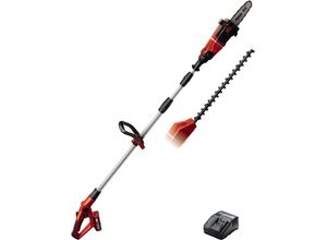 Zustand: Neu - Hochentaster - Einhell - - - Der Einhell Akku-Hochentaster GC-LC 18/20 Li T eignet sich perfekt für die regelmäßige Pflege von Bäumen und höheren Sträuchern. Der Hochentaster gehört zur leistungsstarken und flexiblen Power X-Change-Reihe von Einhell. Als Mitglied der Power X-Change-Familie kann der Hochentaster mit allen hochwertigen Lithium-Ionen-Akkus der Systemreihe betrieben werden. Die Lieferung erfolgt inklusive einem 5,2Ah Akku sowie einem Fastcharger. Ausgerüstet ist der Akku-Hochentaster mit einem OREGON-Qualitätsschwerts und -kette. Mit einer Schwertlänge von 200 mm und einer Schnittgeschwindigkeit von 5.5 Metern pro Sekunde können auch mittlere Äste problemlos geschnitten werden. Der Motorkopf ist durch die Neigung von 30° Grad optimal einsetzbar, zusammen mit der Verlängerungsstange können damit höher gelegene Äste auch bei engem Bewuchs mühelos erreicht werden. Der robuste Krallenanschlag ist aus Metall gefertigt und auf eine hohe Lebensdauer ausgelegt, zudem verfügt der Hochentaster über einen Kettenfangbolzen für die erhöhte Sicherheit während der Arbeit. Die zusätzliche gummierte Haltefläche eignet sich zum ergonomischen Arbeiten und bietet einen festen, sicheren Halt, zudem ist der Entaster mit einem Tragegurt ausgestattet. - Verkäufer: Amazon im amazon.de Marketplace Ein praktisches Kit mit Akku und Ladegerät, das eine gute Basis für die Gartenpflege darstellt. ![]() Garten-Multifunktionsgerät EINHELL 'GE-HC 18 Li T Kit', rot, Garten-Multifunktionsgeräte, mit Akku und Ladegerät