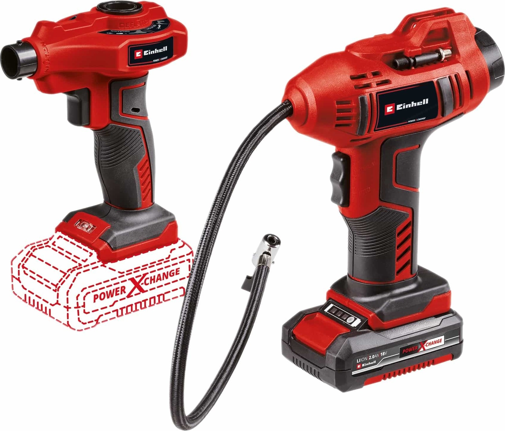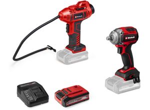 EAN: 4006825673531 - Der Akku-AutokompressorCC 18 Li und die Akku-LuftpumpeAP 18 Li sind Mitglieder der Power X-Change Familie und können mit allen Akkus und Ladegeräten der Systemfamilie kombiniert werden. Der handliche Akku-Kompressor eignet sich zum Aufpumpen von Autoreifen, Radreifen oder Bällen. Per digitaler Druckanzeige lässt sich der gewünschte Druck bis 11 bar einstellen. Er wird mit einem Aufblas-Adapter-Set und einem 60 cm Druckluftschlauch geliefert. Die Akku-Luftpumpe dient mit ihren zwei Ventiladaptern zum Aufblasen von Schlauchbooten, Luftmatratzen und Freizeitartikeln oder als Werkstattbläser und zum Reinigen von Arbeitsflächen. Lieferung inkl. 1x 2,0 Ah Akku und Ladegerät. Features: - Mitglieder der Power X-Change Familie, 1 x 18V Batterie notwendig - Akku-AutokompressorCC 18 Li: - Ideal zum Aufpumpen von Autoreifen, Radreifen, Bällen - Digitale Druckanzeige zum einfachen und schnellen Ablesen - Einfaches Einstellen des gewünschten Drucks bis max. 11 bar - Autom. Abschalt-Funktion bei Erreichen des eingestellten Drucks - Manuelles Aufpumpen ohne Voreinstellung möglich - Integrierte Aufbewahrung des 3-teiligen Aufblas-Adapter-Sets - 60 cm Druckluftschlauch mit Reifenventil für flexible Reichweite - Akku-LuftpumpeAP 18 Li: - Zum Aufpumpen von Schlauchbooten/Luftmatratzen/Freizeitartikeln - Inkl. 2 Ventiladapter für eine flexible Anwendung - Verwendung zum Entlüften durch einfachen Wechsel des Aufsatzes - Nutzung als Werkstattbläser zur Reinigung der ... Ein umfassendes Maschinen-Set, das neben dem Autokompressor auch einen Akku-Schlagschrauber, Akku und Ladegerät beinhaltet und somit eine breite Anwendungspalette abdeckt. ![]() Akku-Schlagschrauber EINHELL 'PROFESSIONAL Maschinen-Set TP-CW 18/350-C + CE-CC 18 Kit', schwarz (schwarz, rot), Schrauber, Inkl. Akku und Ladegerät