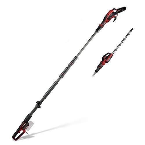 Einhell - EAN: 04006825681093 - Das Einhell Professional Akku-Multifunktionswerkzeug GP-HC 18/5020 Li T BL-Solo ist ein unverzichtbares Gerät der Einhell Power X-Change Familie zur kabellosen Baum- und Heckenpflege. Als 2-in-1-Gerät kommt es für den professionellen Allround-Einsatz mit einem hochwertigen Heckenscheren-Aufsatz sowie einem Kettensägen-Aufsatz, die werkzeuglos und schnell gewechselt werden können. Angetrieben wird das Gerät von einem Einhell Brushless Motor. Dieser bürstenlose Motor bietet mehr Kraft und eine längere Laufzeit als herkömmliche Kohlebürsten-Motoren. Der Teleskopstiel des Akku-Multifunktionswerkzeugs ist werkzeuglos in der Länge verstellbar und verfügt über praktische Halteflächen mit Softgrip. Im Einsatz als Stab-Heckenschere kann das Gerät in der Gesamtlänge von 220 bis 290 cm verstellt werden. Der Heckenscheren-Aufsatz ist 8-fach neigbar, mit lasergeschnittenen, diamantgeschliffenen Messern aus Stahl für 50 cm Schnittlänge und 25 mm Zahnabstand ausgestattet. Das robuste Metallgetriebe sorgt für eine hohe Lebensdauer. Der Hochentaster-Aufsatz kommt mit hochwertigem OREGON Schwert und Kette mit 18 cm Schnittlänge und bis zu 7 m/s Kettengeschwindigkeit. Die automatische Kettenschmierung mitsamt großem öltank mit Schauglas sorgt für einen optimalen, langlebigen Einsatz. Ein integrierter Metallhaken erlaubt das einfache Greifen und Herabziehen von ästen. Als Hochentaster ist das Multifunktionswerkzeug verstellbar zwischen 174 und 250 cm ... ![]() Einhell Professional Akku-Multifunktionsantrieb GP-HC 18/5020 Li T BL-Solo, 18Volt, Hochentaster