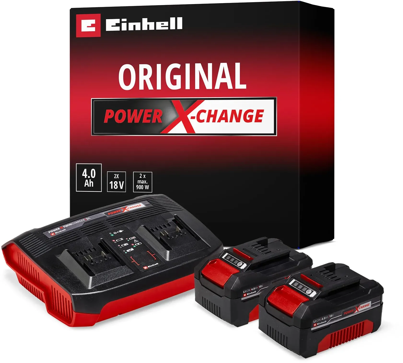 14 Händlerangebote bei billiger.de - Kategorie: Zubehör für Elektrowerkzeug - Einhell - Starter-Set Das Einhell 2x 4,0 Ah & Twincharger-Kit ist ein optimales Set für Einsteiger in die Power X-Change-Reihe. Das Set umfasst zwei 4,0 Ah Akkus und einen Twincharger. Power X-Change Die Power X-Change-Systemreihe bietet mehr Leistung und mehr Ausdauer in einem grenzenlos untereinander kombinierbaren System aus Akkus, Ladegeräten und Geräten. Ready to go Mit dem Twincharger sind die 4,0 Ah Akkus nach nur 75 Minuten einsatzbereit. Bleiben die Akkus länger im Ladegerät, werden sie schonend auf 100% geladen. Twincharger Mit dem Twincharger können zwei 18 Volt PXC-Akkus parallel in einem Ladezyklus an nur einer Steckdose geladen werden. Sicherheit Das Batteriemanagementsystem ABS überwacht die Parameter des Akkus und sorgt für höchste Sicherheit, optimale Performance und maximale Laufzeit. Intelligentes Lademanagement Für den optimalen, schonenden Ladevorgang und hohe Sicherheit sorgen das intelligente Lademanagement und die permanente Akkuüberwachung. Keine Selbstentladung Der Akku widersteht dem Memory-Effekt und der batterieüblichen Selbstentladung. Eine 3-stufige LED-Anzeige gibt stets Auskunft über den Ladezustand. - GTIN:4006825655766 Ein solides Starter-Kit mit zwei 4,0 Ah Akkus und Twincharger von einem bekannten Anbieter. ![]() Einhell 2x 4,0Ah & Twincharger Kit, Set