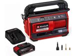 Einhell - EAN: 4066738039039 - Einhell Akku-Kompressor PRESSITO 18/25 Power X-Change (18 V, max. 11 bar, inkl. 3-tlg. Adapter-Set, inkl. 71 cm Hochdruckschlauch und 1,6 m Niederdruckschlauch, mit Akku 2,5 Ah + LadegerätArtikelbeschreibungDie Luft ist raus? Nicht mit dem Einhell Akku-Kompressor PRESSITO 18/25: Als Teil der leistungsstarken Power X-Change Familie wird der Kompressor mit einem 18 Volt Power X-Change Akku betrieben. Seine Hochdruckpumpe erreicht bis zu 11 bar und eignet sich ideal für das Aufpumpen von Bällen, Fahrrad- und Autoreifen. Die Niederdruckpumpe sorgt für Luft in Luftmatratzen und Schwimmtieren für den Pool. Ablassen lässt sich die Luft im Anschluss mithilfe der Niederdruck-Saugoption. Auf der zweizeiligen LCD-Anzeige können Ist- sowie Soll-Druck in bar, psi oder kPa abgelesen werden. Ist der gewünschte Druck erreicht, schaltet sich die Pumpe automatisch ab. Ein Tastschalter zum Aufpumpen im Hochdruckbereich ohne Druckvoreinstellung vereinfacht die Handhabung zusätzlich. Das im Lieferumfang enthaltene 3-teilige Adapter-Set enthält eine Ballnadel, einen Reifenadapter und einen konischen Adapter. Die Adapter finden im praktischen, integrierten Aufbewahrungsfach im Kompressorgehäuse Platz. So gehen keine Einzelteile verloren. Auch der Hoch- sowie der Niederdruckschlauch lassen sich platzsparend in integrierten Fächern unterbringen. Ein praktischer Tragegriff und sein geringes Gewicht machen den Kompressor zum handlichen Begleiter für unterwegs und ... Dieses Angebot ist besonders empfehlenswert, da es den Akku-Kompressor inklusive eines leistungsstarken 5,2 Ah Akkus und Ladegerät zu einem guten Preis bietet. ![]() ![]()