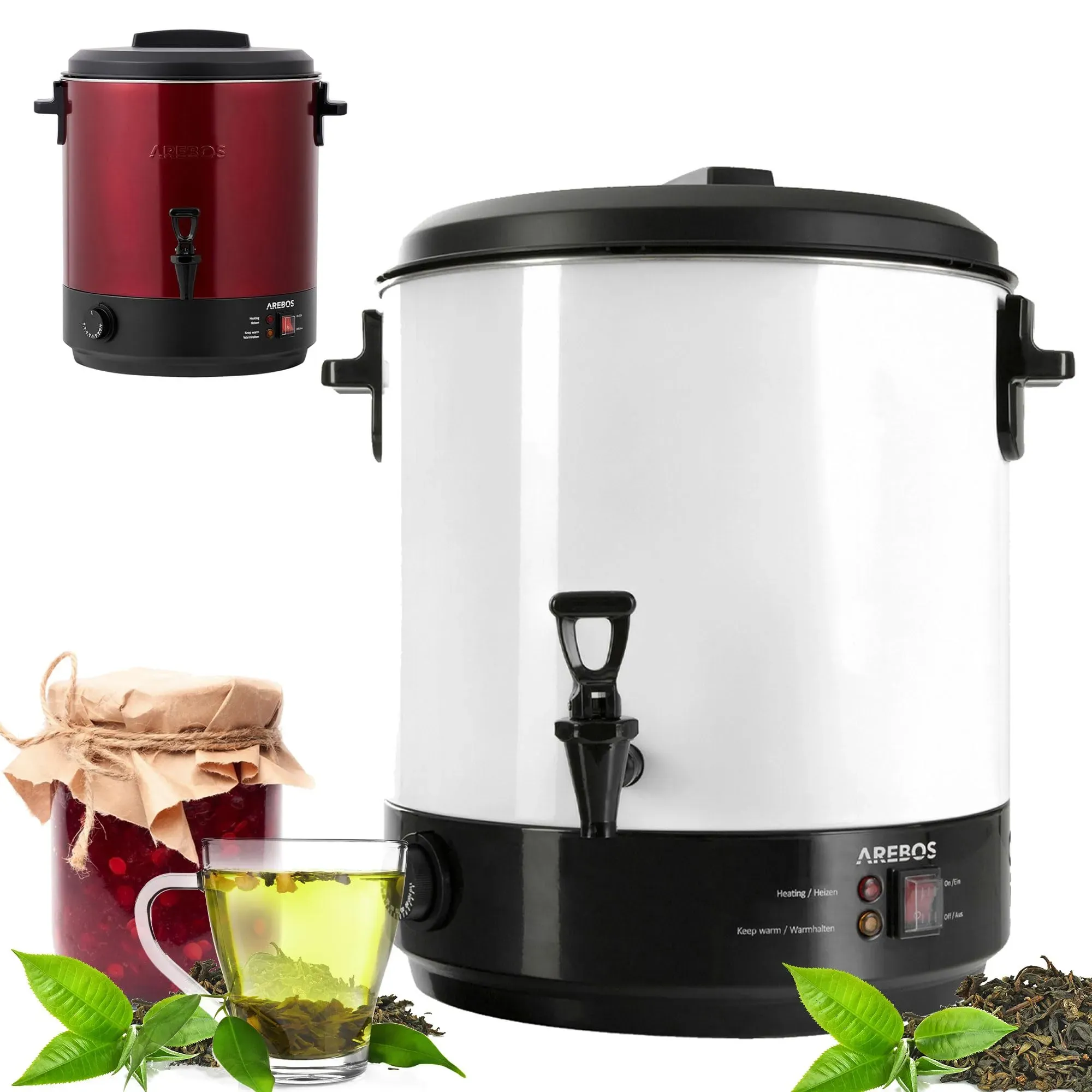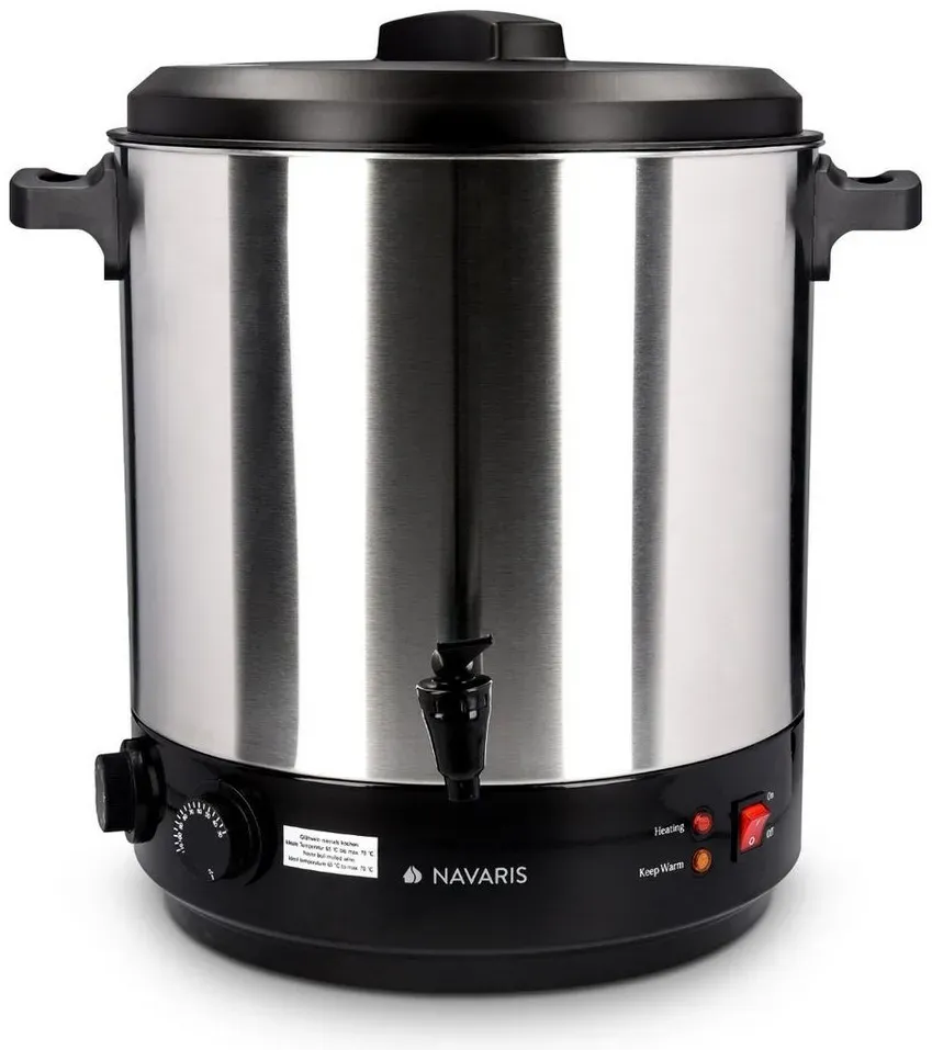 Kategorie: Einkochautomaten - Arebos - GTIN:4260627420087 - [Eigene Kreation] Lecker aus dem Einkochglas - Der AREBOS Einkochautomat ist unser Star wenn es um die Konservierung von Obst, Gemüse, Wurstkreationen, selbst zubereiteter Marmeladen oder herzhafter Fleischspezialitäten geht. Der Einkochautomat bietet mit einem Volumen von 28 L viel Platz, um den Inhalt von bis zu 14x 1-Liter-Einkochgläsern mit Hitze in haltbare Konserven zu verwandeln. [Multitalent] Unser Einkochautomat bzw. Heißgetränkebereiter ist der Experte wenn es ums dauerhafte Heiß machen, Warm halten und Einkochen geht. Dank seines geschmacksechten Verarbeitung aus Edelstahl, dem Cool-Touch-Ablasshahn sowie der integrierten Warmhaltefunktion eignet er sich auch perfekt als Heißgetränkespender für Glühwein, Punsch, Tee und anderen Getränken. Jede Party sowie Buffet wird mit dem Einkochautomaten von AREBOS ein Hit! [Einfache Bedienung] Der stufenlose Temperaturregler von 30 - 110 C und die gut sichtbare Kontrollleuchte sorgen für eine stets kontrollierte Anwendung. Durch den überhitzungsschutz schaltet sich das Gerät bei überhitzung automatisch ab. [Zubereitung von Speisen] Mit dem Einkochtopf kommt Abwechslung auf den Speiseplan. Auch für die kulinarische Verpflegung von mehreren Personen eignet sich der Topf hervorragend. Ohne großen Aufwand kann eine ganze Gruppe mit Suppen, Würsten, Eintöpfen, Soßen und vielem mehr verköstigt werden. [Einfache Reinigung] Der Zapfhahn an der Vorderseite erlaubt das ... Dieser Navaris Glühweinkocher ist ein vielseitiger elektrischer Einkochautomat mit Timer und Zapfhahn zu einem attraktiven Preis. ![]() ![]() Navaris Glühweinkocher Einkochautomat - 27L Einkochtopf zum Einkochen - Glühweintopf Punschkocher mit Timer - Einmachtopf Einkocher Einweckautomat - Mit Zapfhahn Silber