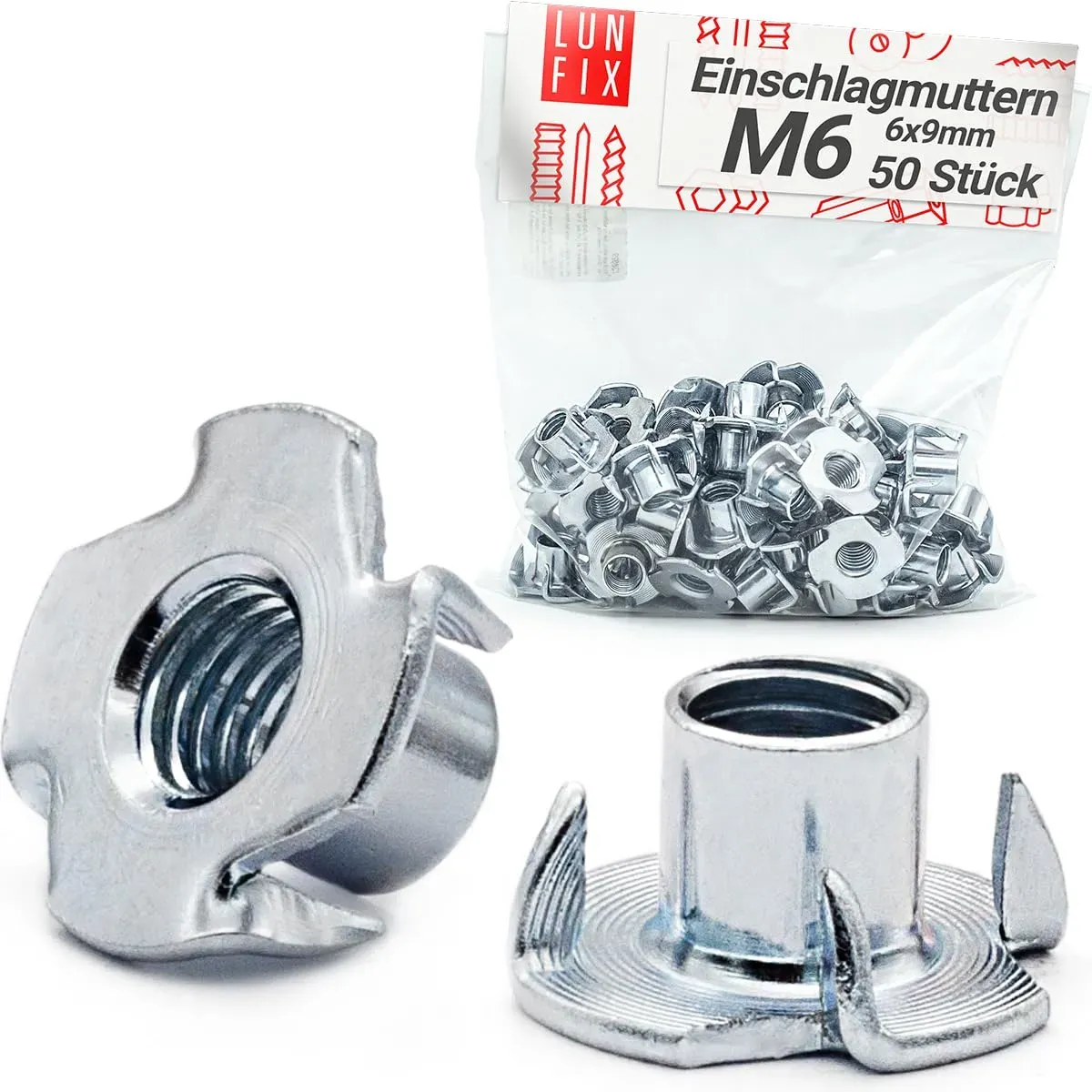 Für eine gute Kaufentscheidung empfiehlt sich ein Set mit galvanisch verzinkten Einschlagmuttern M6 x 9 mm, idealerweise mit Einschlagspitzen für besseren Halt, im Preisbereich von etwa 5,50 € bis 7,00 € pro 100 Stück. Achten Sie auf die Bohrlochgröße und die Kompatibilität mit Ihrem Werkstoff. Beispiele zum direkten Vergleich und Kauf: