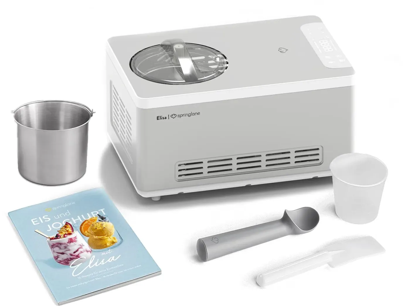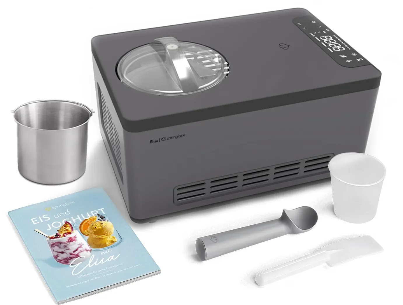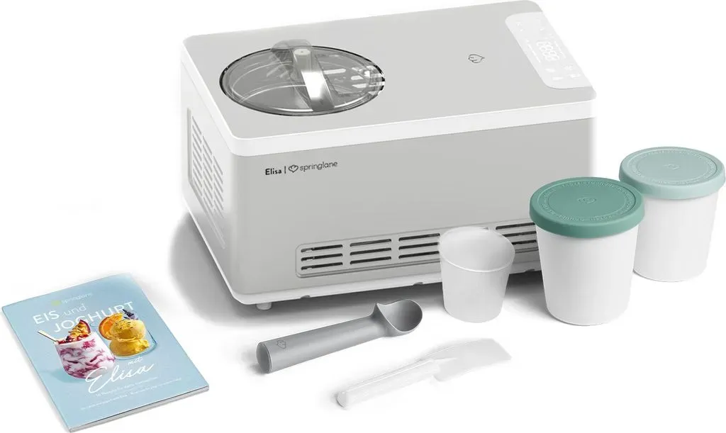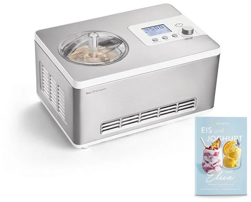 Zustand: Gebraucht - Speiseeisbereiter - Springlane Kitchen - Elisa - EAN: 4056499046261 - PERFEKTE ERGEBNISSE - In nur 45 Minuten zaubert Elisa 2 Liter cremiges Speiseeis und verwandelt durch das integrierte Heizelement Milch innerhalb weniger Stunden in leckeren selbstgemachten Joghurt. VIELSEITIG - Das Multitalent verfügt über 4 Programme, die einfach über das digitale Bedienfeld eingestellt werden: Eiscreme, Joghurt, Kühlen und Rühren. Durch die automatische Nachkühlfunktion hält Elisa dein fertiges Eis auch nach der Zubereitung kalt. LEISTUNGSSTARK - Eismaschine Elisa kommt durch den integrierten Kompressor und die 220 Watt Kühlleistung ohne Vorkühlen aus und bereitet Eis im Gefrierer bis zu -35 Grad zu AUSSTATTUNG - Elisa überzeugt mit vollautomatischem, selbstkühlendem Kompressor, Heizelement, entnehmbarem Eis- und Joghurt-Behälter, Deckel mit Sichtfenster, Rührteil, Messbecher, Spatel, Eisportionierer, und Rezeptheft. UNSER VERSPRECHEN - Wir wollen, dass du zu 100% zufrieden bist. Deshalb bieten wir einen persönlichen Kundenservice & kostenlosen Rückversand. - 1 Händler im amazon.de Marketplace Dieses Angebot beinhaltet ein Rezeptheft, was besonders für Einsteiger hilfreich ist. ![]() ![]() SPRINGLANE Eismaschine & Joghurtbereiter Elisa 2,0 L mit selbstkühlendem Kompressor 220 W, aus Edelstahl mit Kühl- und Heizfunktion, inkl. Rezeptheft (Elisa Silber)
