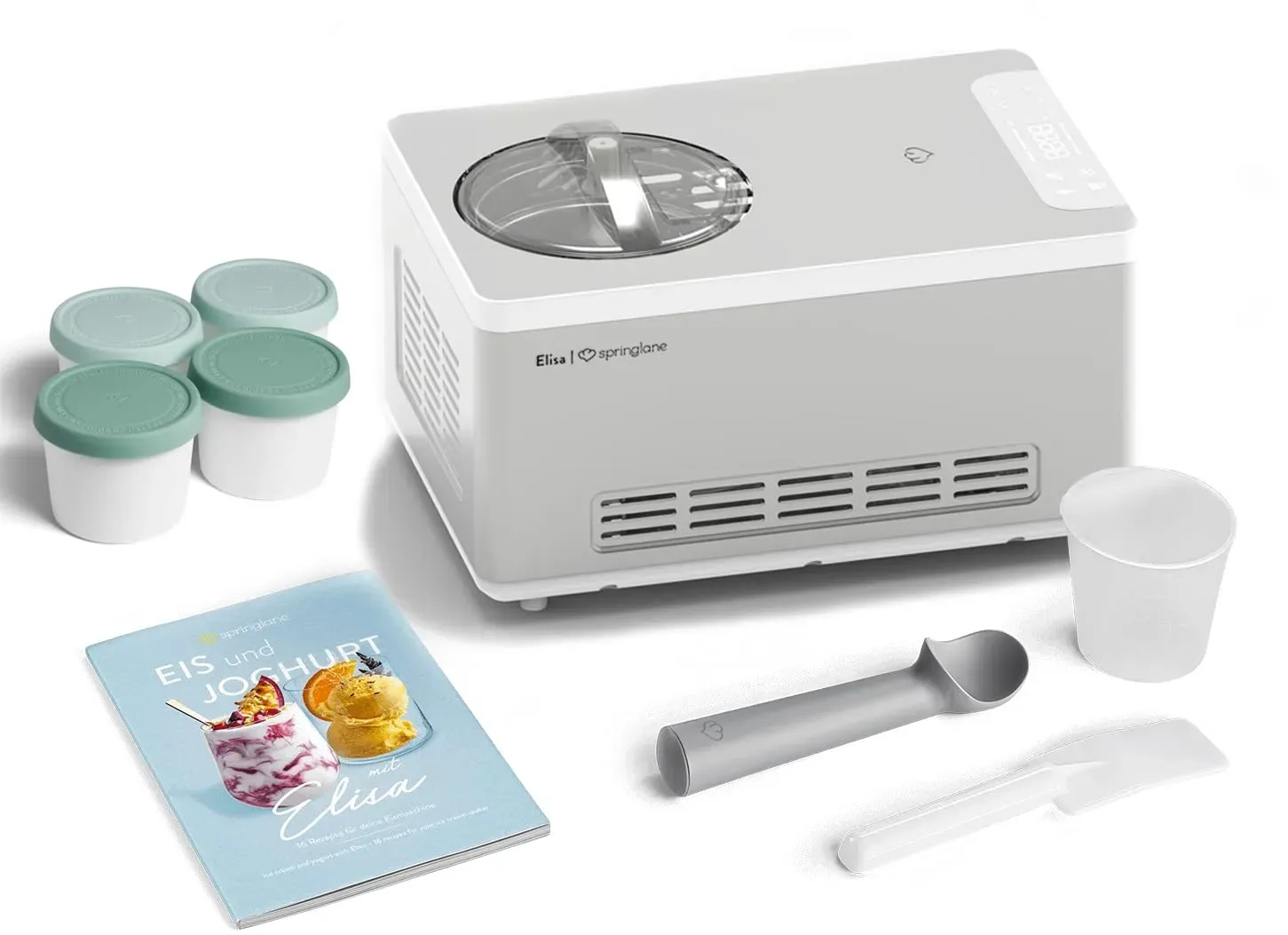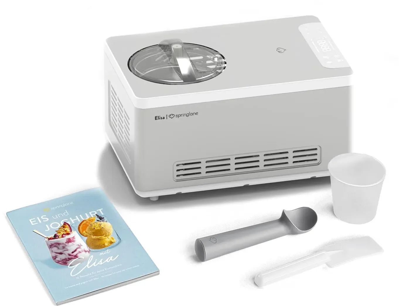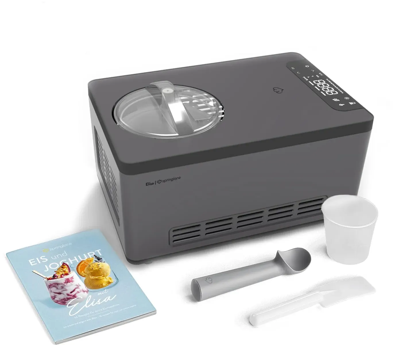 Zustand: Gebraucht - Speiseeisbereiter - Springlane Kitchen - Elisa - EAN: 4056499046261 - PERFEKTE ERGEBNISSE - In nur 45 Minuten zaubert Elisa 2 Liter cremiges Speiseeis und verwandelt durch das integrierte Heizelement Milch innerhalb weniger Stunden in leckeren selbstgemachten Joghurt. VIELSEITIG - Das Multitalent verfügt über 4 Programme, die einfach über das digitale Bedienfeld eingestellt werden: Eiscreme, Joghurt, Kühlen und Rühren. Durch die automatische Nachkühlfunktion hält Elisa dein fertiges Eis auch nach der Zubereitung kalt. LEISTUNGSSTARK - Eismaschine Elisa kommt durch den integrierten Kompressor und die 220 Watt Kühlleistung ohne Vorkühlen aus und bereitet Eis im Gefrierer bis zu -35 Grad zu AUSSTATTUNG - Elisa überzeugt mit vollautomatischem, selbstkühlendem Kompressor, Heizelement, entnehmbarem Eis- und Joghurt-Behälter, Deckel mit Sichtfenster, Rührteil, Messbecher, Spatel, Eisportionierer, und Rezeptheft. UNSER VERSPRECHEN - Wir wollen, dass du zu 100% zufrieden bist. Deshalb bieten wir einen persönlichen Kundenservice & kostenlosen Rückversand. - 1 Händler im amazon.de Marketplace Dieses Angebot beinhaltet ein Rezeptheft, was besonders für Einsteiger hilfreich ist. ![]() ![]() SPRINGLANE Eismaschine & Joghurtbereiter Elisa 2,0 L mit selbstkühlendem Kompressor 220 W, aus Edelstahl mit Kühl- und Heizfunktion, inkl. Rezeptheft (Elisa Silber)