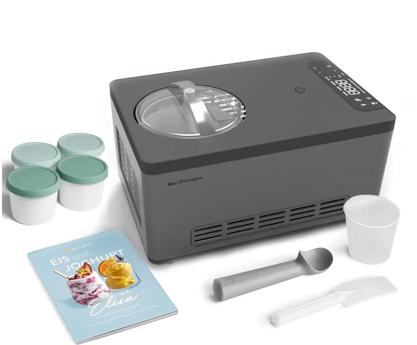 EAN: 4056499029141 - PERFEKTE ERGEBNISSE - In nur 45 Minuten zaubert Elisa 2 Liter cremiges Speiseeis und verwandelt durch das integrierte Heizelement Milch innerhalb weniger Stunden in leckeren selbstgemachten Joghurt.VIELSEITIG - Das Multitalent verfügt über 4 Programme, die einfach über das digitale Bedienfeld eingestellt werden: Eiscreme, Joghurt, Kühlen und Rühren. Durch die automatische Nachkühlfunktion hält Ellisa dein fertiges Eis auch nach der Zubereitung kalt.LEISTUNGSSTARK - Eismaschine Elisa kommt durch den integrierten Kompressor und die 220 Watt Kühlleistung ohne Vorkühlen aus und bereitet Eis im Gefrierer bis zu -35 Grad zuAUSSTATTUNG - Elisa überzeugt mit vollautomatischem, selbstkühlendem Kompressor, Heizelement, entnehmbarem Eis- und Joghurt-Behälter, Deckel mit Sichtfenster, Rührteil, Messbecher, Spatel, Eisportionierer und Rezeptheft.UNSER VERSPRECHEN - Wir möchten Dir die Entscheidung so einfach wie möglich machen: Sollte mit dem Artikel etwas nicht in Ordnung sein, helfen wir Dir gerne weiter.Lust auf Eis? Kein Joghurt mehr im Haus? Elisa hilft aus.Cremig, zart und immer lecker Eis und Joghurt schmeckt rund um die Uhr! Erst recht, wenn es aus 2-in-1 Eismaschine und Joghurtbereiter Elisa von Springlanekommt.Die hauseigene Eisdiele ist kein Traum mehr: Mit 42,2 x 28,2 x 27,2 cmfindet Elisa in jeder Küche einen geeigneten Platz zum Rühren und Kühlen. Heute Stracciatella, morgen Erdbeere einfach nach Lust und Laune loslegen.Oder du eröffnest deine eigene ... Dieses Angebot ist ideal für Familien oder größere Haushalte, da es vier Eisbehälter enthält. ![]() ![]() SPRINGLANE Eismaschine & Joghurtbereiter Elisa 2,0 L mit selbstkühlendem Kompressor 220 W, aus Edelstahl mit Kühl- und Heizfunktion (Elisa Anthrazit, Eismaschine + 4 Eisbehälter Mint)