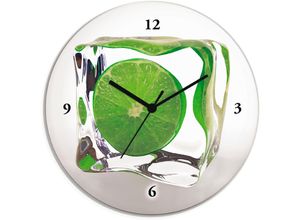 Wanduhren Wohnen Dekoration Raumgestaltung Wohnraumuhren - - Titel: Zitrone im Eiswürfel, Copyright: Fotolia LLC / Tomislav Forgo, Modellnummer: 5119UG. Unsere runde Glasuhr als analoge Funkuhr oder Quarzuhr: wird im Digitaldruck mit einem Motiv auf 4 mm starkes Float Glas: gedruckt. Die exzellente Farbleuchtkraft und strahlende Brillanz unserer hochwertigen UV-beständigen Druckfarben: sorgen dafür, dass die Farben nach vielen Jahren immer noch genauso strahlen wie am ersten Tag. Der rückseitige Druck ist zusätzlich mit einem unauffälligen weissen Schutzanstrich versiegelt. Wir verarbeiten keinen Foliendruck. Die Farben und die Verarbeitung sind frei von Lösungsmitteln, Schadstoffen und Geruch, allergiefrei und daher auch für Kinder- und Schlafzimmer geeignet. Die Zeit wird von einem schwarzen Stunden-, Minuten- und Sekundenzeiger: angezeigt. Die Zeiger werden wahlweise durch ein geräuschloses Funk- oder Quarzuhrwerk: angetrieben. Das lautlose Uhrwerk: der wahlweise analogen Funkuhr oder Quarzuhr hat eine Hersteller von zwei Jahren. Unsere Funkuhr stellt sich automatisch auf Winter- und Sommerzeit um und wird mit dem Zeitzeichensender DCF77 versorgt. Aufgrund von topographischen und meteorologischen Verhältnissen kann der Empfang beeinträchtigt werden. Sollten Sie kein Empfang haben, lässt sich die Uhr auch manuell Einstellen ohne Funksignal. Das Zifferblatt beider Uhren ist gut lesbar. Lediglich eine 1x 1,5V AA Batterie ist im Lieferumfang nicht enthalten. Das Uhrwerk ... ![]() Artland Wanduhr »Limette im Eiswürfel«, wahlweise mit Quarz- oder Funkuhrwerk, lautlos ohne Tickgeräusche