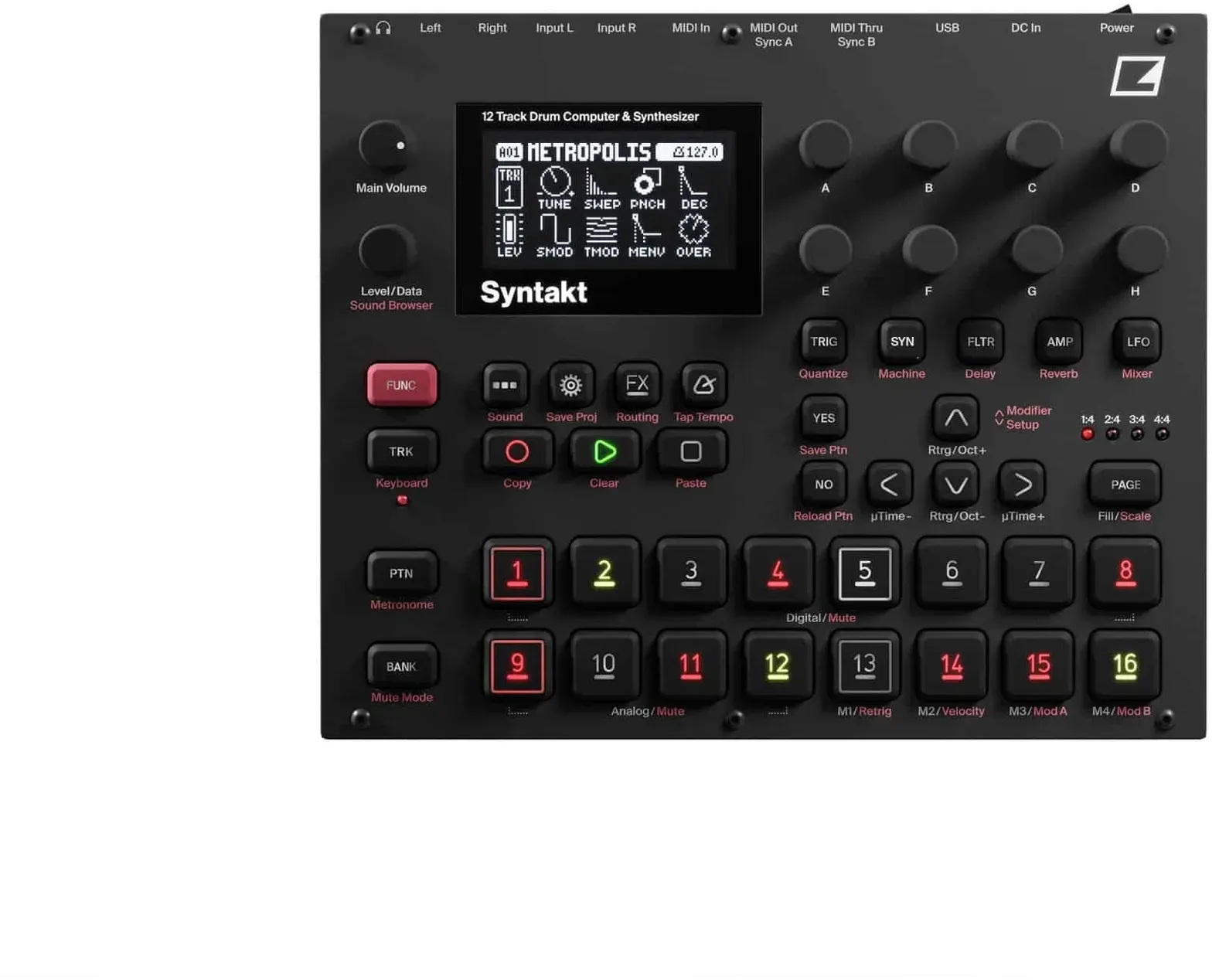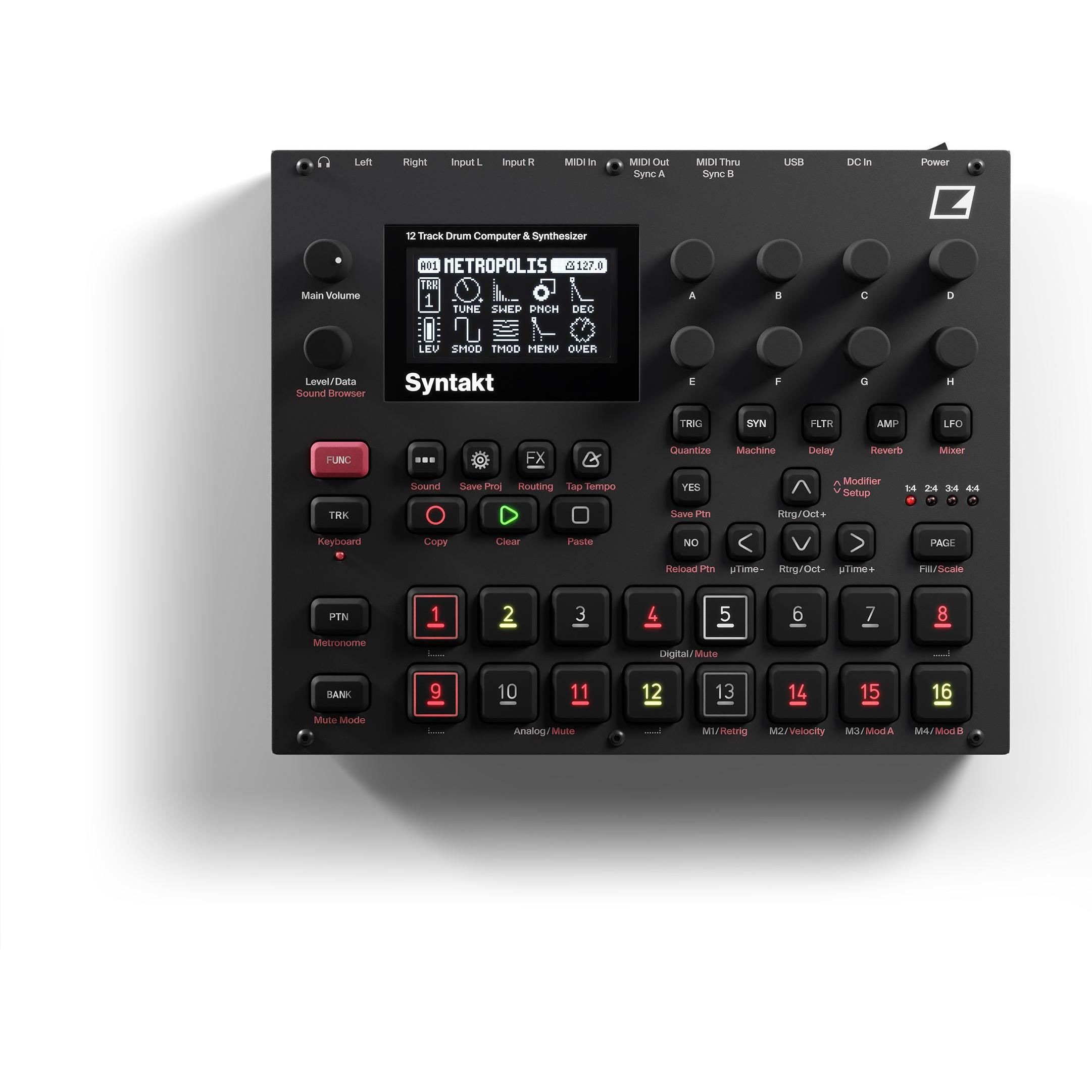 Zubehör Prozessoren Tasteninstrumente Synthesizer Drumcomputer Musikinstrumente - EAN:7350049240749 - Elektron Syntakt; 12 Track Drumcomputer und Synthesizer; 8 digitale Tracks: 10 wählbare Machines, digital overdrive, digital multimode filter, digital base-widthfilter und 2x LFO pro Track; 3 Analog Drum Tracks: 15 wählbare Machines, analog overdrive, analog multimode filter und 2 LFOs pro Track; 1 Analog Cymbal Track: 12 wählbare Machines, analog overdrive, analog multimode filter und 2 LFOs pro Track; Jeder der 12 Tracks kann als MIDI Track verwendet werden; vier ausdrucksstarke Modifier; zusätzlicher FX Track mit Delay, Reverb, analog Distortion usw.; Keyboard Mode mit 36 verschiedenen Skalen; Sequencer: 64 Steps pro Pattern und Spur, individuelle Patternlänge pro Spur, einstellbarer Clock-Teiler pro Spur, Parameter locks und Retrig; MIDI In/Out/Thru; 2x 6,3 mm Klinkeneingang; 2 6,3 mm Klinkenausgang; 6,3 mm Kopfhörerausgang; Abmessungen (B x T x H): 215 x 176 x 63 mm; Gewicht: 1,53 kg - gefunden von Kelkoo Dieses Bundle enthält den Elektron Syntakt und ein passendes EVA Case, ideal für den Schutz und Transport. ![]()