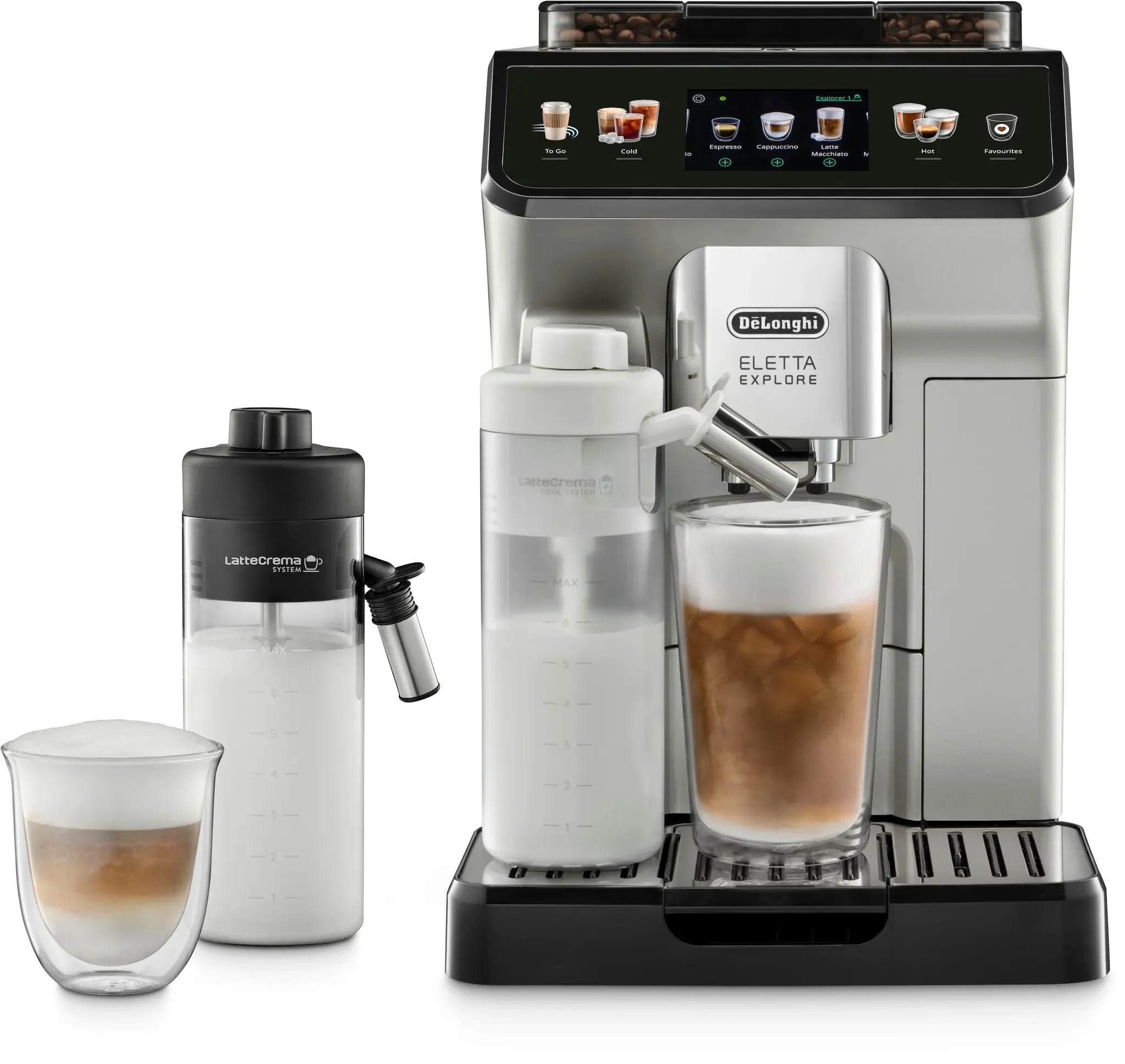 De'Longhi - EAN: 8004399021143 - LatteCrema Hot und LatteCrema Cool Milchschaumsystem für die Zubereitung von heißem oder kaltem Milchschaum3,5 TFT Display mit 4 großen farbigen Touch-Icons für leichtere Getränkevorauswahl4 Nutzerprofile zur individuellen Speicherung der Präferenzen40 vorinstallierte RezepteAuto-Clean-Funktion für automatische, hygienische Reinigung der Milchleitungen mit Heißwasser und DampfEletta Explore verkörpert die langjährige Erfahrung und das technische Know-How von De Longhi mit dem Anspruch auf perfekten Kaffeegenuss. Immer frisch gemahlen und perfekt aufgebrüht.Mit der größten Rezeptvielfalt aller Zeiten (40+) bietet dieses Modell perfekten Kaffeegenuss für Zuhause und zum Mitnehmen.Das neu entwickelte LatteCrema Cool System schäumt Milch* oder pflanzliche Milchalternativen erstmals kalt auf. Lernen Sie Cappuccino, Flat White & Co. auf eine neue Art und Weise kennen. Ideal für heiße Sommertage.* für perfekten kalten Milchschaum empfehlen wir die Verwendung von pflanzlichen Milchalternativen oder entrahmte KuhmilchHEISSE ODER ERFRISCHENDE KAFFEESPEZIALITäTEN AUF KNOPFDRUCKPerfekter Milchschaum auf Knopfdruck: heiß ODER kalt aufgeschäumt Sie entscheiden! Das Latte Crema System mit zwei abnehmbaren Karaffen (schwarze Karaffe = heiß / weiße Karaffe = kalt) ist im Lieferumfang inklusive.KAFFEE JEDERZEIT UND üBERALL GENIESSEN MIT DER TO GO FUNKTIONDie Abstellfläche lässt sich mittig aufklappen und bietet Platz für bis zu 475ml große Travel Mugs. Alle ... Quelle bietet den Kaffeevollautomaten ebenfalls für 679 Euro an und hebt die umfangreichen Funktionen wie das Touch-Display und die herausnehmbare Brühgruppe hervor. ![]() ![]() De'Longhi Kaffeevollautomat »Eletta Explore ECAM450.55.S - 40 Rezepte, heißer & kalter Milchschaum« 3,5" Touch-Display, herausnehmbare Brühgruppe, einstellbarer Mahlgrad, 98558240-0 silber