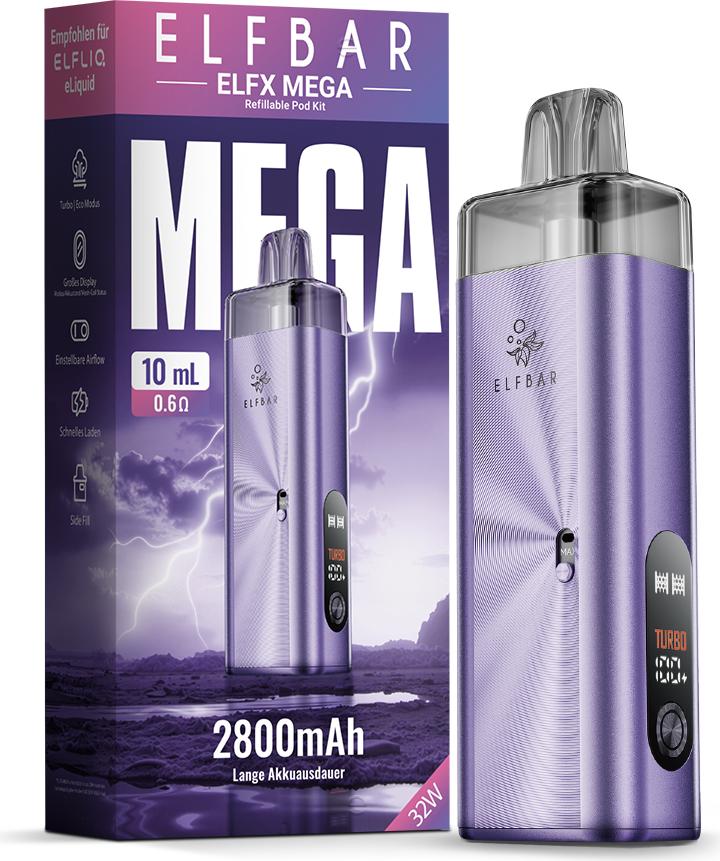 EAN: 6932570195128 - ELFBAR ELX MEGA Akkuträger | Pod SystemDer ELFBAR ELX MEGA Akkuträger ist die leistungsstarke Basis für ein komfortables Pod-System und eignet sich je nach Pod ideal für MTL und RDL. Die Bedienung ist besonders einfach: Dank Zugautomatik brauchst du keinen Knopf einfach ziehen und dampfen.Für lange Laufzeit sorgt der fest verbaute 2.800 mAh Hochleistungs-Akku. über zwei Leistungsmodi kannst du das Dampferlebnis flexibel anpassen: Eco für effizienten Akkubetrieb und Turbo für mehr Leistung mit bis zu 32 Watt Ausgangsleistung. Ein gut ablesbares Farbdisplay zeigt dir alle wichtigen Informationen auf einen Blick. Geladen wird schnell und unkompliziert über USB-C.Highlights Akkuträger2.800 mAh Akku (fest verbaut) für lange LaufzeitZugautomatik kein Knopf, nur ziehen2 Leistungsmodi: Eco | TurboMax. 32 Watt AusgangsleistungFarbdisplay für alle wichtigen InfosUSB-C Ladeanschluss (5 V / 1 A)Technische Daten AkkuträgerAkku-Kapazität: 2.800 mAh (fest verbaut)Ausgangsleistung: bis 32 WLeistungsmodi: Eco | TurboLadespannung: 5 V / 1 ALadeanschluss: USB-CDisplay: FarbdisplayAktivierung: Zugautomatik - bei kaufland.de - aus Yadore Produktdaten Dieses Angebot ist empfehlenswert, da es ein Pod System mit 2800mAh Akku und der Wahl zwischen 5ml und 10ml Refillable Pods zu einem guten Preis anbietet. ![]() ![]() ELFBAR ELFX - MEGA E eBay Zigarette Pod System Refillable Pod 5ml und 10ml 2800mAh Akku