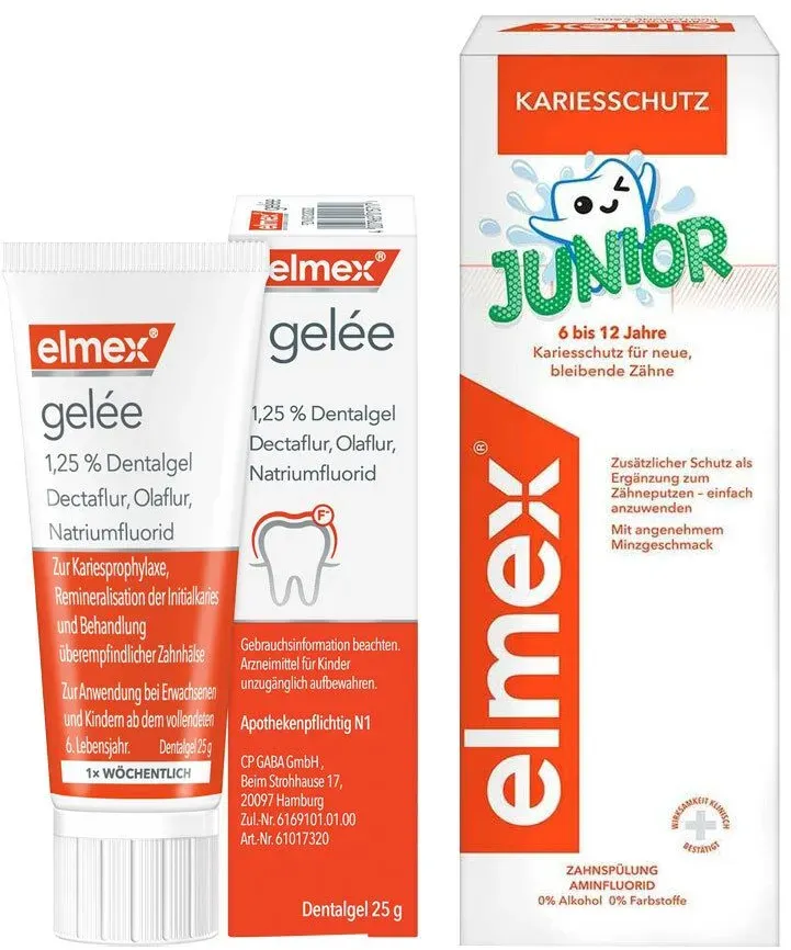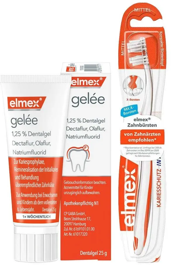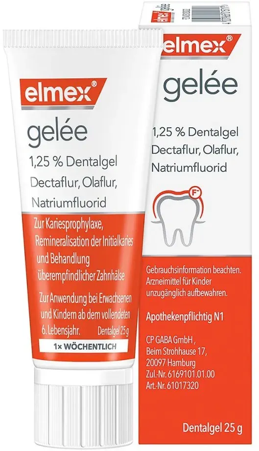 Zustand: Neu - 506,00 € / kg - Zahncremes - ELMEX CP GABA GmbH, Deutschland - 3120822 03120822 - EAN: 4007965011757 EAN: 4007965015717 EAN: 4150031208220 - elmex Gelée Zahnpasta zum Schutz vor Karies, stärkt den Zahnschmelz und behandelt überempfindliche Zahnhälse. elmex Gelée enthält: Aminfluorid Dectaflur, Aminfluorid Olaflur und Natriumfluorid. Das entspricht einem Fluoridgehalt von 1,25 %. Sonstige Bestandteile sind: gereinigtes Wasser, Propylenglycol, Hyetellose, Saccharin, Apfel-Aroma, Pfefferminz-Aroma, Krauseminzöl, Menthol-Aroma. Falls nicht anders verordnet, ist die übliche Dosis für Erwachsene und Kinder ab dem vollendeten 6. Lebensjahr: einmal wöchentlich etwa 1 cm Gel auf die Zahnbürste auftragen und die Zähne bürsten. Nach 2 bis 3 Minuten ausspülen. Apothekenpflichtiges Arzneimittel (PZN: 3120822). Zu Risiken und Nebenwirkungen lesen Sie die Packungsbeilage und fragen Sie Ihre Ärztin, Ihren Arzt oder in Ihrer Apotheke. - 21 Händler im amazon.de Marketplace Ein preislich attraktives Angebot von versandapo.de. ![]() ![]() Elmex Gelee