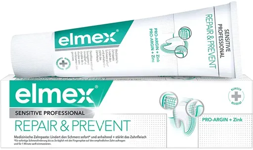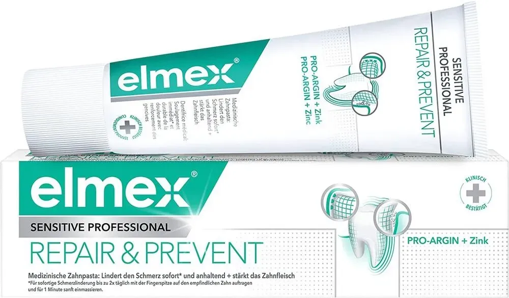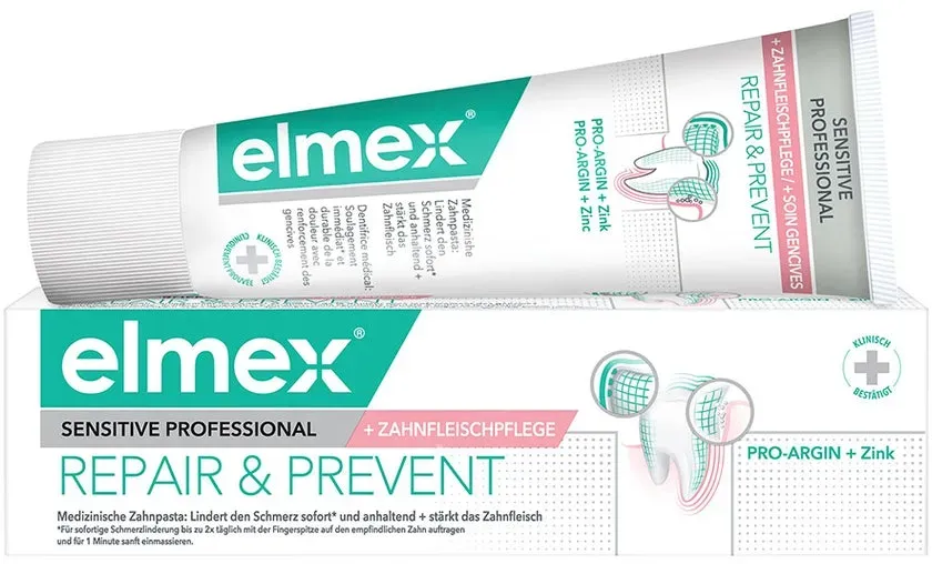 Verfügbarkeit: 1-3 Werktage - 93,20 €/l - Kategorie: Zahnpflegeartikel - Elmex - GTIN:8718951193765 - PZN:11517249 - Produkteigenschaften: Elmex Sensitive Professional Repair & Prevent elmex® SENSITIVE PROFESSIONAL Repair & Prevent Zahnpasta mit PRO-ARGIN Technologie und Zink. Die einzigartige PRO-ARGIN Technol... - 6,99 Euro bei Mycare - gefunden von billiger.de Dieses Angebot von Amazon Marketplace ist mit 7.43 Euro eine beliebte Wahl für eine einzelne Tube Elmex Sensitive Professional Repair & Prevent. ![]() ![]() elmex Zahnpasta Sensitive Professional Repair & Prevent 75 ml ? medizinische Zahnreinigung für sofortigen*, anhaltenden Schutz ? beugt Zahnfleischrückgang & neuen Schmerzen vor