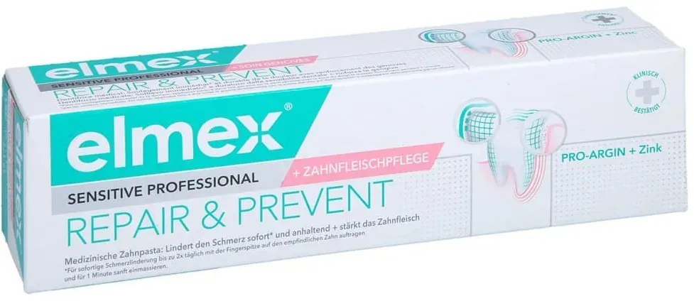 93,20 / l - Kategorie: Zahnpflegeartikel - Elmex - GTIN:8718951193765 - PZN:11517249 - Produkteigenschaften: Elmex Sensitive Professional Repair & Prevent elmex SENSITIVE PROFESSIONAL Repair & Prevent Zahnpasta mit PRO-ARGIN Technologie und Zink. Die einzigartige PRO-ARGIN Technol... - 6,99 Euro bei Mycare - gefunden von billiger.de Preisapo bietet die Zahnpasta für 7.11 Euro an, was ein fairer Preis für eine einzelne Tube ist. ![]() ![]() ELMEX SENSITIVE PROFESSIONAL Repair & Prevent 75 ml