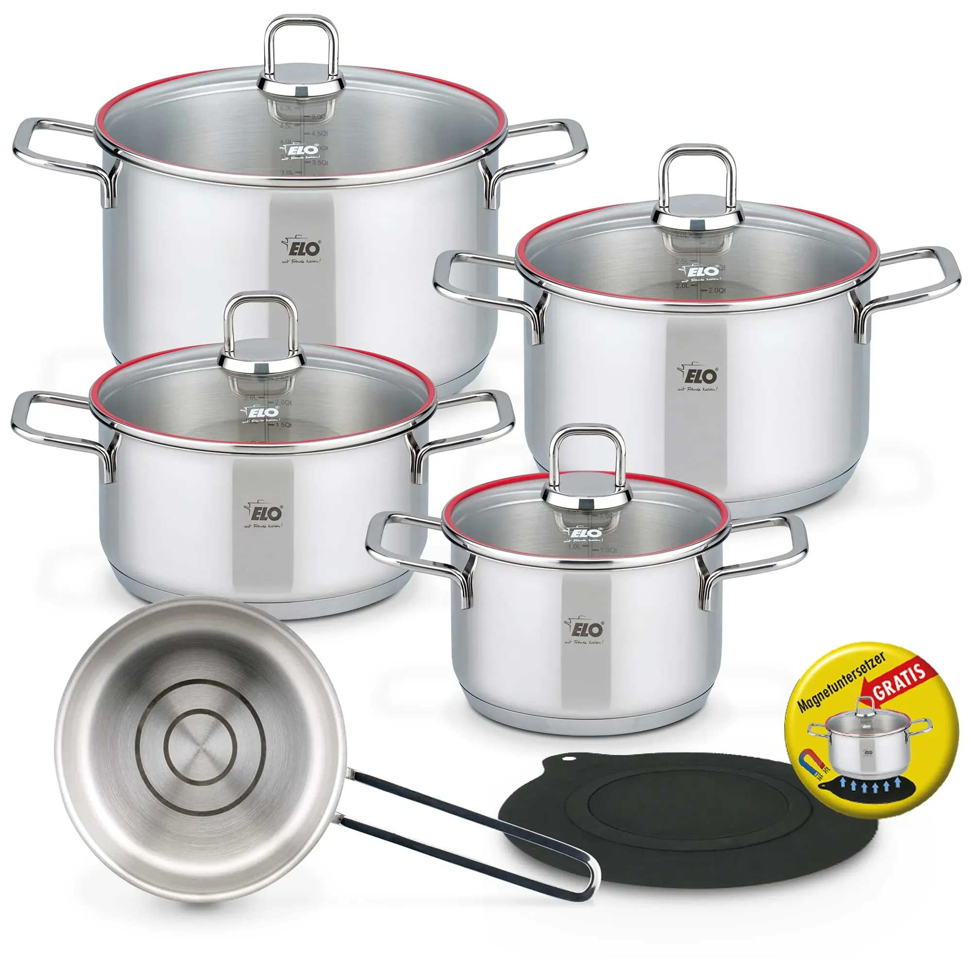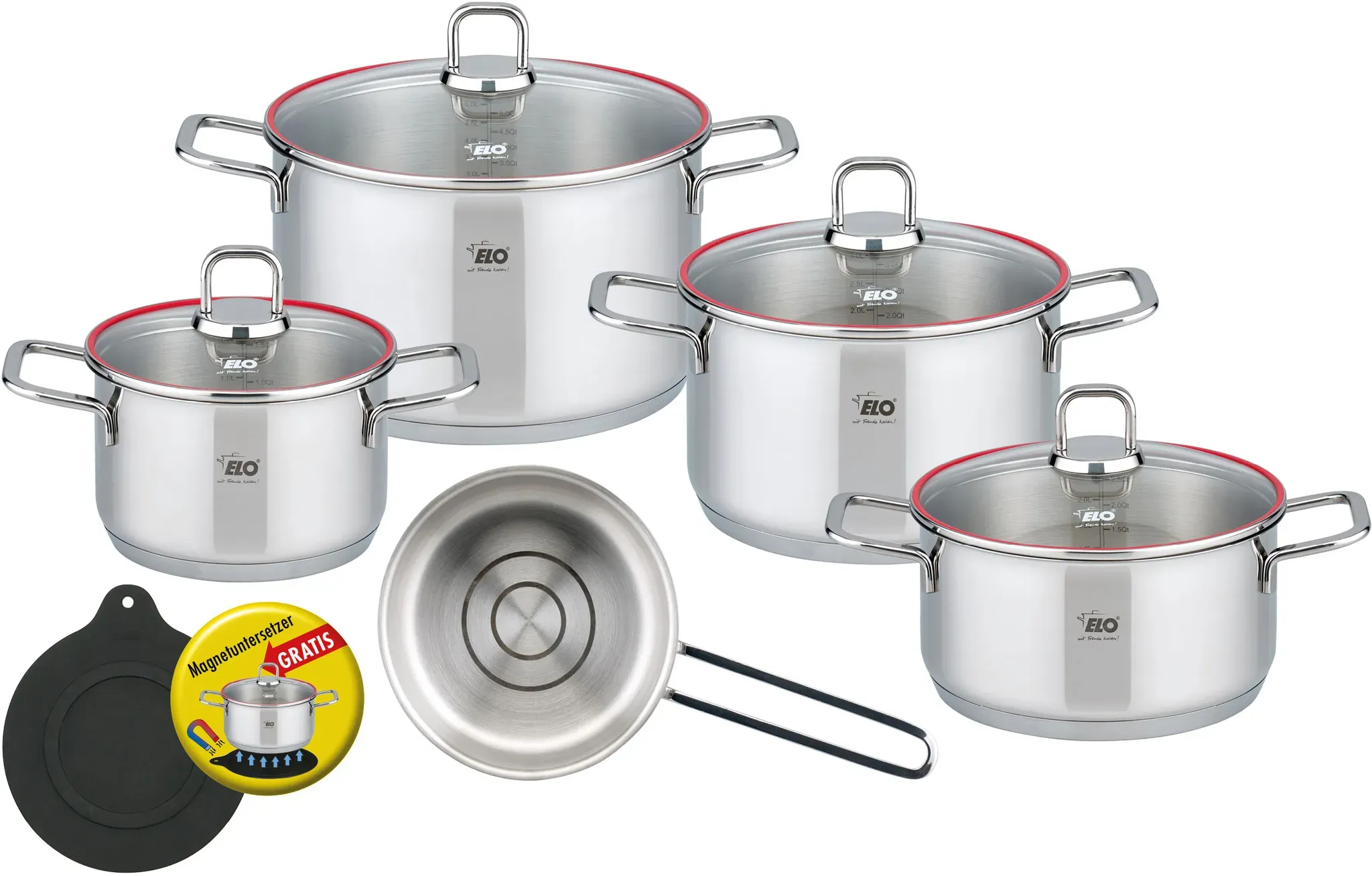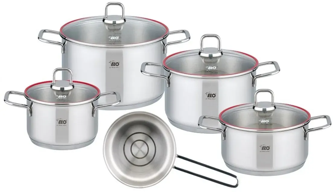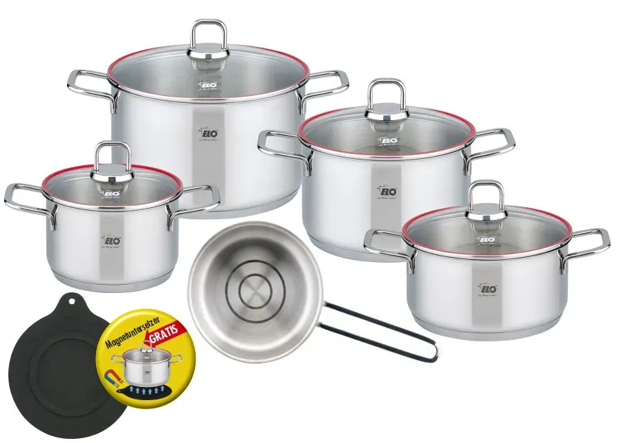 Zustand: Neu - Topfsets - ELO ELO-Stahlwaren - Karl Gruenewald & Sohn GmbH & Co. KG - 72906 - EAN: 4006925729060 - FUNKTION TRIFFT DESIGN - Der rote Silikonring schützt vor Kondenswasser, das Entlüftungsloch reguliert Dampf - und die Griffe bleiben dabei angenehm kühl. Der hochglanzpolierte Edelstahl sorgt zusätzlich für glänzende Auftritte in jeder Küche. CLEVER KOCHEN, FETTARM GENIESSEN - Mit integriertem Öl-Dosiersystem und Volumenskala für bewusstes Kochen ohne zusätzliches Zubehör. Das hochwertige Topf Set ist ideal für Hobbyköche, Profis - und jede moderne Küchenausstattung. STARKE LEISTUNG AUF JEDEM HERD - Der energiesparende Impactboden im Topf Set sorgt für schnelle, gleichmäßige Hitzeverteilung - ideal für Induktion, Gas, Ceran & alle Herdarten. HITZEBESTÄNDIG & PFLEGELEICHT - Das Kochtopfset aus robustem Edelstahl 18/10 ist spülmaschinengeeignet und backofengeeignet bis 240€¯°C (mit Glasdeckel bis 180€¯°C). Modern, langlebig und mehrfach ausgezeichnet. SEIT ÜBER 9 N QUALITÄT AUS DEUTSCHLAND - ELO steht für langlebiges Kochgeschirr mit durchdachten Details. Im Set: 1x Bratentopf 20€¯cm, 3x Fleischtöpfe 16/20/24€¯cm, 1x Stielkasserolle 16€¯cm, 1x Magnetuntersetzer. - bei Amazon.de Dieses 10-teilige Edelstahl-Topfset wurde als Testsieger ausgezeichnet und bietet somit eine hohe Qualität und Funktionalität. ![]() ![]() Elo Excellent - Topfset - eBay Edelstahl, 10-tlg. 72906 - Testsieger Stiftung Warentest