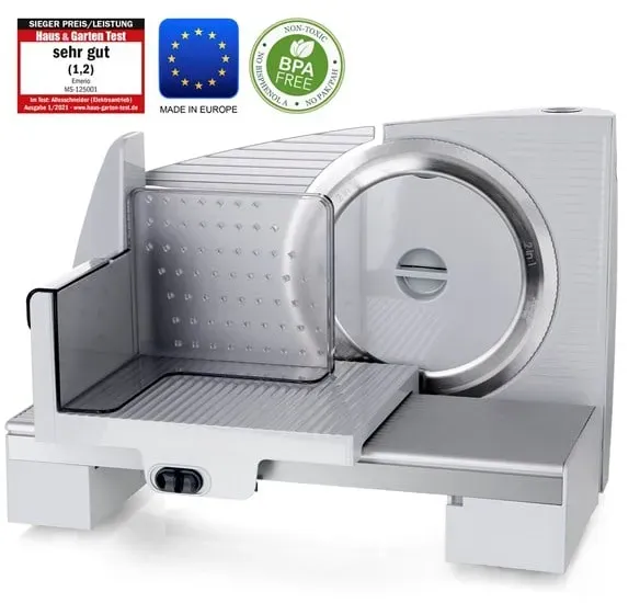 Emerio - EAN: 7333282003425 - Entdecken Sie die Präzision des Emerio Allesschneiders und verwandeln Sie Ihre Küche in eine professionelle Arbeitsumgebung! Mit seinem leistungsstarken ca. 100-Watt-Motor und dem hochwertigen Edelstahlmesser schneidet dieser Allesschneider mühelos durch eine Vielzahl von Lebensmitteln. Die manuelle Schnittbreitenverstellung von ca. 0-17 mm ermöglicht es Ihnen, die Dicke Ihrer Scheiben nach Ihren Vorlieben anzupassen. Mit dem Sicherheits-Ein/Aus-Schalter und dem Schieber mit Fingerschutz können Sie Ihre Zutaten sicher und präzise verarbeiten. Die Anti-Rutsch-Füße sorgen für Stabilität während des Betriebs, während das faltbare Design eine platzsparende Aufbewahrung ermöglicht. Erleben Sie die Vielseitigkeit und Qualität des Emerio Allesschneiders und bringen Sie Ihre Küchenkreationen auf das nächste Level! - bei poco.de - aus Yadore Produktdaten Dieses Modell ist "Made in EU", BPA-frei und platzsparend klappbar, was es zu einer umweltbewussten und praktischen Wahl macht. ![]() ![]() Emerio Allesschneider"Made in EU" MS-125000, Edelstahl Messereinheit in Deutschland produziert, einstellbar 0-17mm, BPA frei, platzsparend klappbar, mit Sicherheitsschalter, Eco 100Watt, Weiß