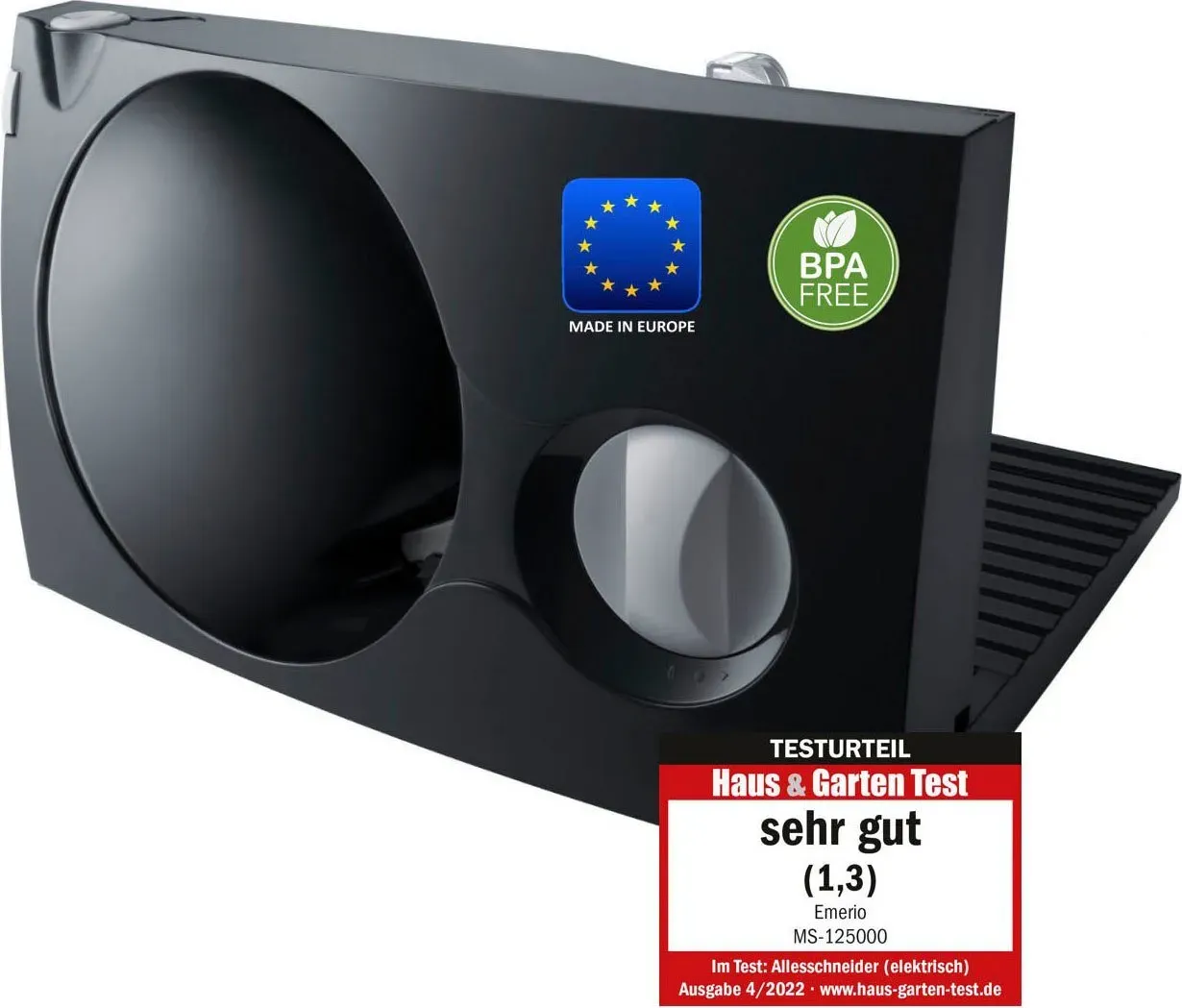 EAN: 7333282003425 - Platzsparend Diesen Allesscheider kann man sehr platzsparend verstauen, da er zusammenklappbar ist. Ideal wenn man wenig Platz in der Küche hat und den vorhandenen Stauraum optimal nutzen möchte. Das Modell verfügt über 4 Gummifüße für den rutschfesten Stand. Diese 4 Gummifüße befinden sich am Hauptgerät unterhalb der Messereinheit.Sicherheitsschaltung Dieser Allesschneider hat eine Tasten-Sicherung verbaut, um die Verletzungsgefahr zu minimieren. Nur wenn beide Tasten zusammen betätigt werden, arbeitet das Gerät. So kann ein unbeabsichtigter Betrieb ausgeschlossen werden - für die Sicherheit unserer Kunden!Qualität aus Deutschland Solingen ist als Herkunftsort für hochwertige Messer aus Edelstahl weltberühmt. Dieses Produkt verfügt über eine Messereinheit, die von der Firma RSG aus Solingen produziert wird. - bei kaufland.de - aus Yadore Produktdaten Dieser schwarze Allesschneider bietet eine gute Balance aus Preis und Leistung mit 100 Watt. ![]() ![]() Emerio Allesschneider MS-125000.1, 100 W schwarz