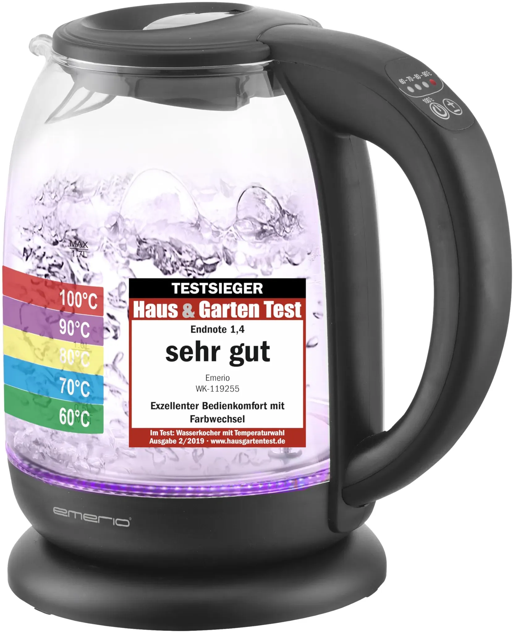 ![]() ![]() EMERIO Wasserkocher | TESTSIEGER Haus & Garten Test 02/2019 | aus hochwertigem Borosilikatglas | mit Temperaturwahl (60-70-80-90-100°C) | BPA-frei | AutoOff & Trockengehschutz | 2200W | WK-119255.5