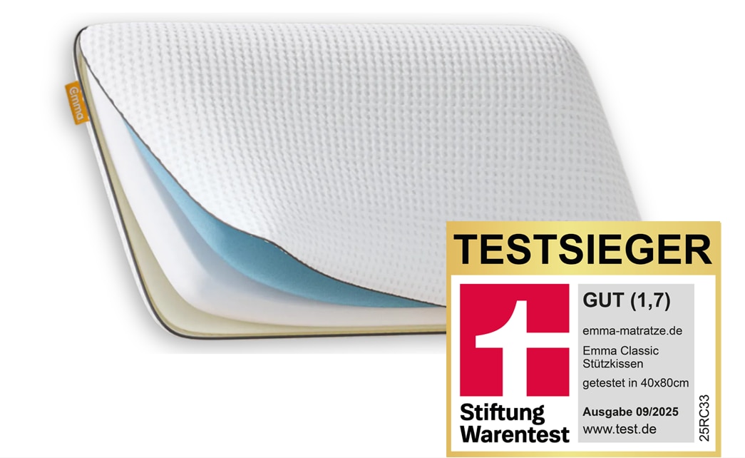 Kategorie: Kissen - Emma - GTIN:4255762744464 - Testsieger 09/2025 – Stiftung Warentest bewertete Emma Classic Stützkissen mit GUT (1,7), getestet in 40x80 cm Ergonomische Nackenstütze – Unterstützt die natürliche Ausrichtung der Halswirbelsäule Höhenverstellbar & praktisch verpackt – Höhe individuell anpassbar; vakuumgerollt geliefert; bis zu 24 Stunden bis zur vollständigen Entfaltung Atmungsaktives Design – Optimierte Luftzirkulation für ein angenehmes Schlafklima Pflegeleicht & hygienisch – Abnehmbarer, waschbarer Bezug mit neuem U-förmigen Rundum-Reißverschluss für einfaches öffnen und Schließen - 63,75 Euro bei Amazon Marketplace Home - gefunden von billiger.de ![]() ![]() Emma Luxus - Stützkissen 40x80
