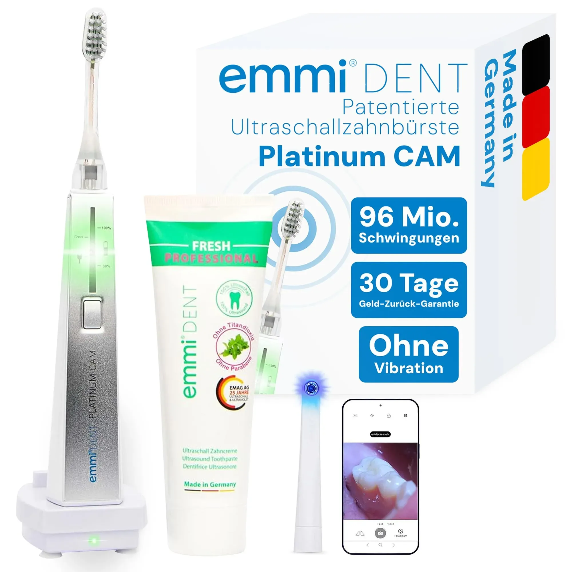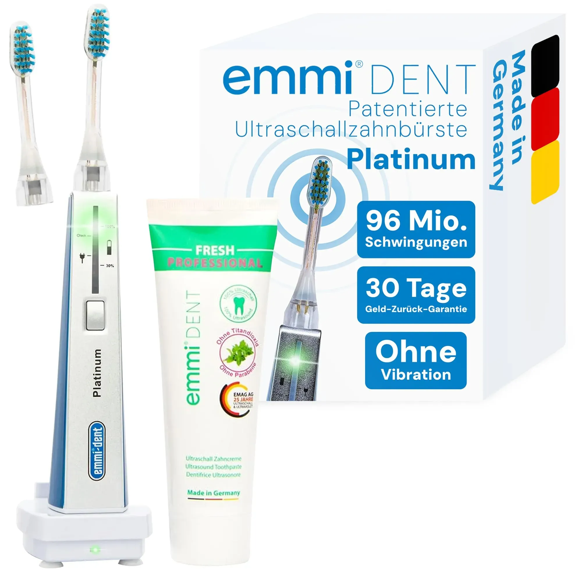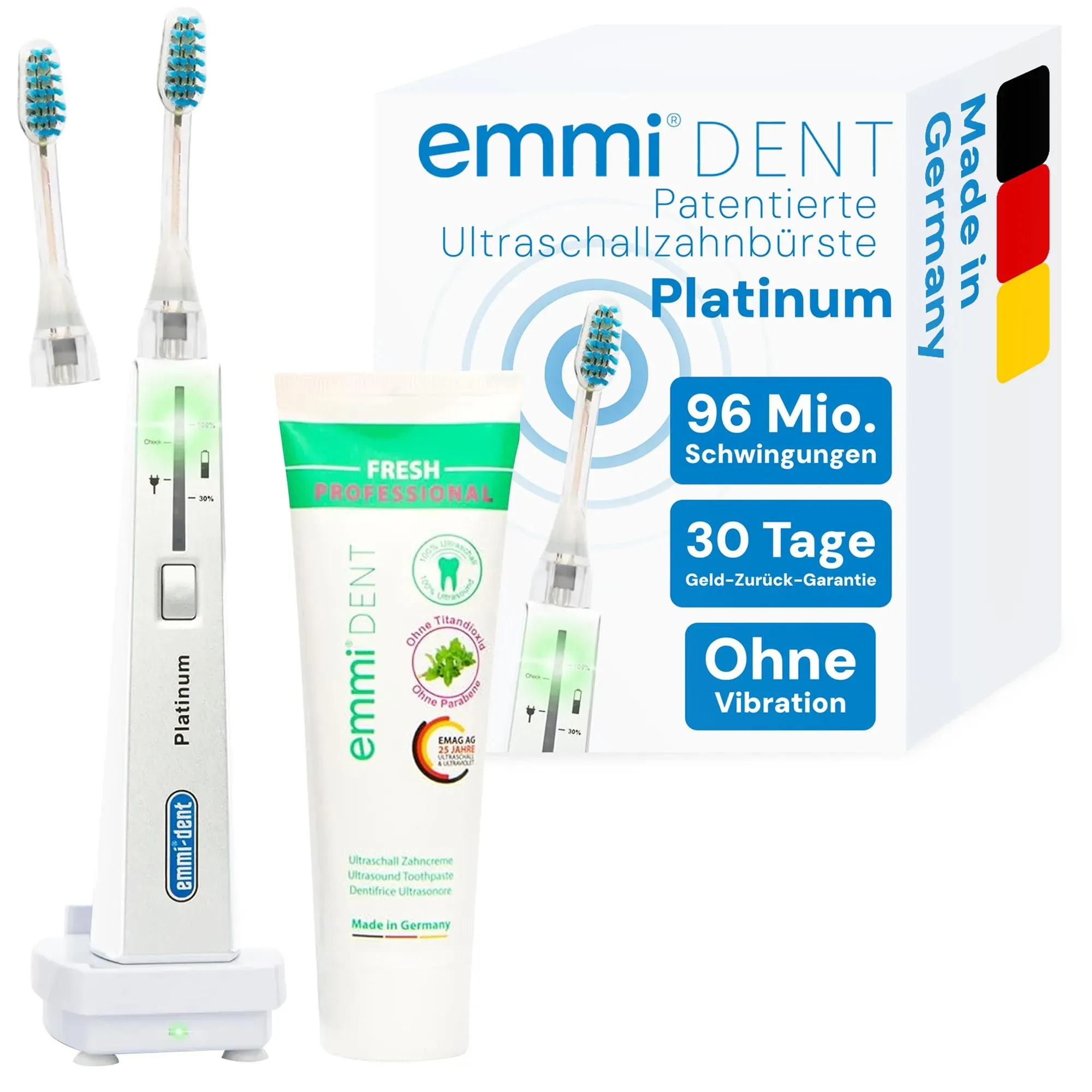 Zustand: Neu - Ultraschall Ultraschallzahnbürsten - Emmi-dent Emmi Ultrasonic GmbH - 60065106 60010855 - EAN: 4040513651067 - ÜBERLEGENE ZAHNHYGIENE: Dank patentierter Ultraschall-Technologie von emmi-dent erfolgt die perfekte Zahnreinigung - ohne mühsames Schrubben mit 96 Mio. Schwingungen pro Minute! Einfach an die Zähne halten und die Ultraschallzahnbürste erledigt den Rest MIT ULTRASCHALL ZAHNCREME: Millionen von Mikrobläschen in der Ultraschallzahncreme dringen auch in kleinste Zahnzwischenräume ein. Frische Zähne, ohne Gefahr für Zahnfleisch und Zahnschmelz SANFT & GRÜNDLICH: 100% Ultraschall mit bis zu 96 Mio. Multifrequenz-Schwingungen pro Minute und die emmi-dent Zahnpasta sorgen für eine sanfte sowie gründliche Zahnreinigung, beugen Zahnfleischentzündungen vor und reduzieren diese PATENTIERTER BÜRSTENKOPF: Der Ultraschall Bürstenkopf entfernt Biofilm, reduziert Plaque und ist Prothesen und Zahnspangen freundlich. Klinisch getestet am Institut für Oralmedizin (ORMED) LIEFERUMFANG: 1x emmi-dent Platinum White, 2x emmi-dent Ultraschall-Aufsteckbürste, 1x emmi-dent Ultraschallzahncreme, 1x Ladestation - Verkäufer: emmi® ultrasonic im amazon.de Marketplace Dieses Starter-Set in Weiß ist eine gute Option für Nutzer, die eine klassische Farbgebung bevorzugen. ![]() ![]() emmi-dent Platinum elektrische Ultraschall Zahnbürste mit 96 Mio. Schwingungen - Für empfindliche Zähne & Zahnfleisch I Optimales Zähneputzen ohne Schrubben I 15 Tage Akkulaufzeit - Starter-Set White