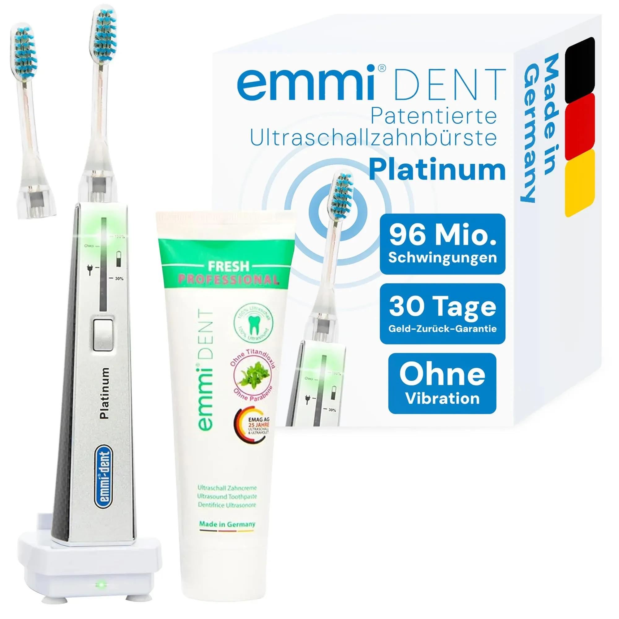 Emmi-dent platinum META PreisvergleichMit dem Meta-Preisvergleich suchen Sie gleichzeitig bei den großen Preisvergleich Portalen!Jetzt live Suche nach emmi-dent platinum starten! Emmi-dent platinum Kaufberatungemmi-dent Platinum - Kaufberatung und ProduktübersichtDie emmi-dent Platinum ist eine hochwertige Ultraschallzahnbürste, die sich durch fortschrittliche Technologie und umfangreiche Funktionen auszeichnet. Hier sind die wichtigsten Aspekte für Ihre Kaufentscheidung: Kernmerkmale und TechnologieDie emmi-dent Platinum arbeitet mit bis zu 96 Millionen Multifrequenz-Schwingungen pro Minute[1][3] und nutzt ein innovatives 4-Pin-System, das den Ultraschall-Takt optimiert und die Effektivität um bis zu viermal erhöht im Vergleich zu älteren Metallic-Modellen[1][3]. Die Vibration ist komplett abschaltbar, sodass Sie 100% reinen Ultraschall nutzen können[3]. Ein besonderer Vorteil ist die lange Akkulaufzeit von bis zu 15 Tagen bei zweimal täglicher Nutzung (2×3 Minuten)[1][3]. Das Gerät wird induktiv geladen und verfügt über eine LED-Akkustandanzeige[1]. Ausstattung und LieferumfangDas emmi-dent Platinum Starter-Set enthält typischerweise[4]: