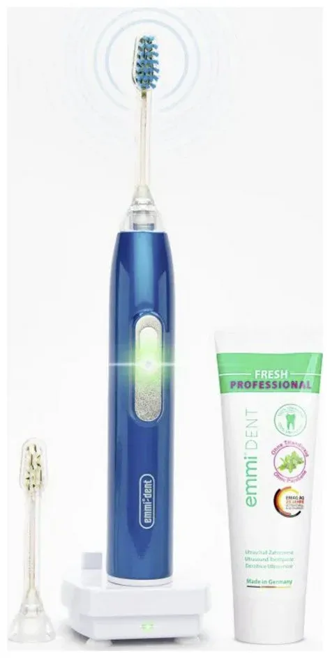 Auf Lager Versand durch Amazonemmi-dent Platinum Ultraschallzahnbürste (Starter-Set Blau) ? 96 Mio. Schwingungen & Ultraschall-Zahnpasta | Sanft zu Zähnen & Zahnfleisch | Kein Schrubben | Bis zu 15 Tage Akkulaufzeit