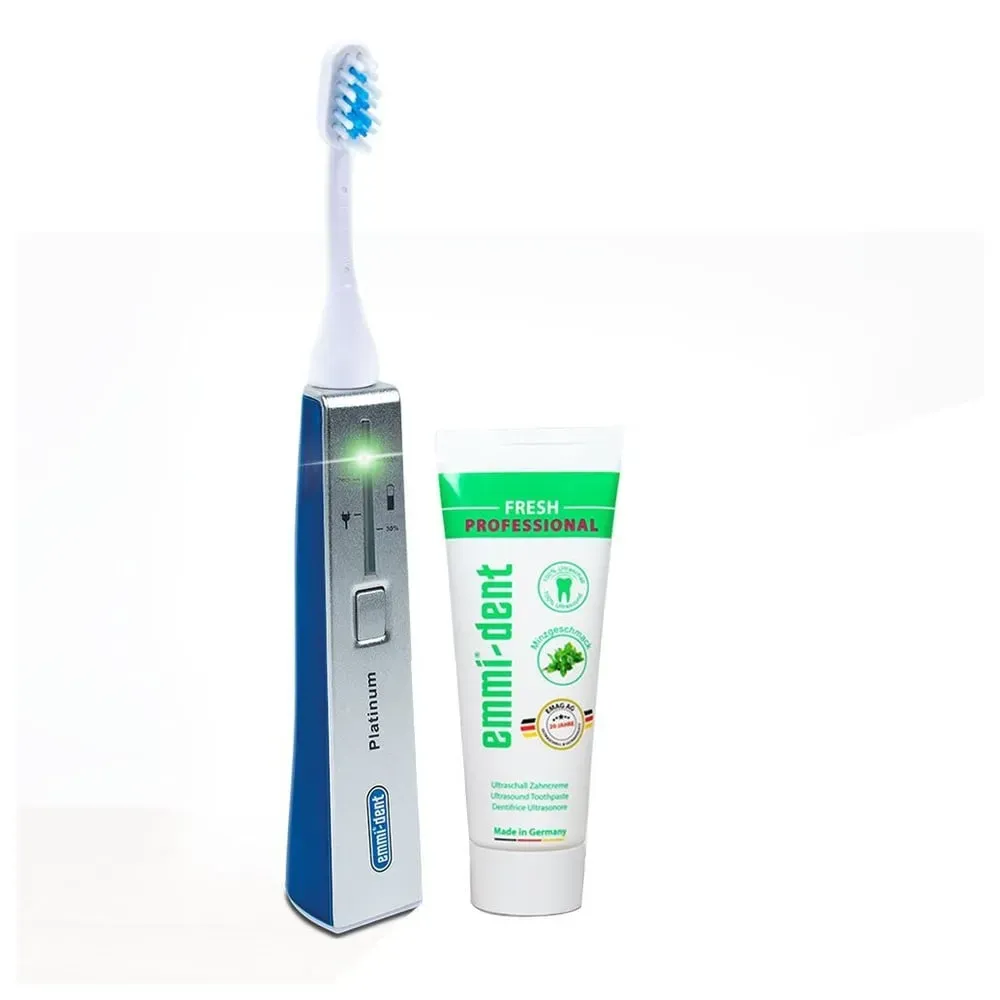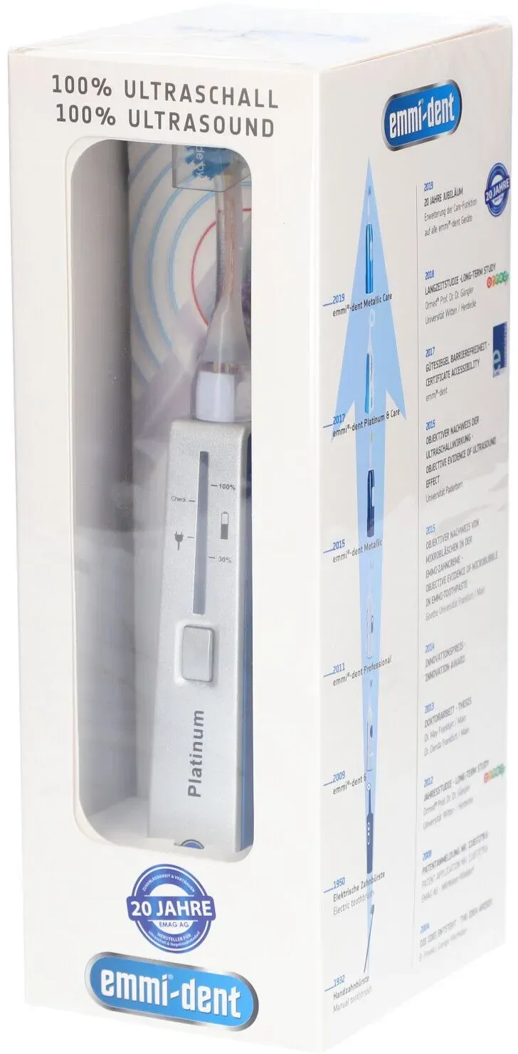 129,00 /Stück - Kategorie: Elektrische Zahnbürsten - Emmi-Dent - GTIN:4040513651135 - PZN:15637134 - Emmi Dent Pla Basis Set Bl Kombipackung 1 Stück - von Emmi Ultrasonic GmbH - Kategorie: Emmi-Dent - versandkostenfrei - 129,00 Euro bei healthii - gefunden von billiger.de Die Emmi-Dent Ultraschallzahnbürste Platinum ist eine leistungsstarke Option für eine gründliche Reinigung. ![]() ![]() Emmi-Dent Ultrashallzahnbürste Platinium