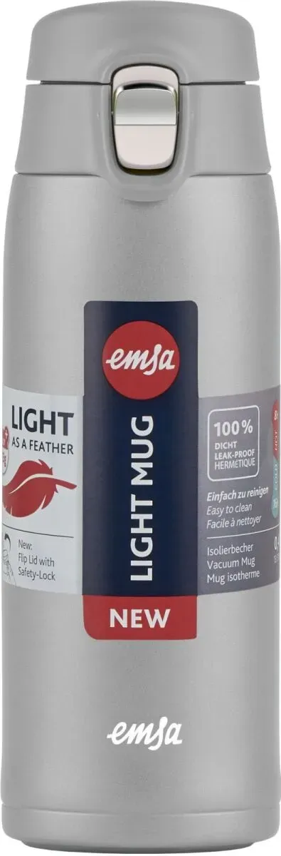 4 Händlerangebote bei billiger.de - Kategorie: Tassen & Becher - Emsa - Ein einfacher und stylischer, leichter Isolierbecher in einem robusten, qualitativ hochwertigen Gehäuse aus Edelstahl - er hält die Getränke 8h lang heiß oder 16h kalt Isolierbecher im schlanken Format mit leichtem Gefäßkörper und einem perfekten Fassungsvermögen von 0,4 Liter Einfaches Klappverschlusssystem, das sich mit einer Hand bedienen lässt, zum hygienischen öffnen und Schließen im Handumdrehen 100 percent auslaufsicher für ein problemloses und sicheres Trinkvergnügen; BPA-frei für gesundes und sorgloses Trinkvergnügen Elegantes ästhetisches Design mit einem verblüffenden matten Finish und mehreren Trendfarben zur Auswahl - GTIN:4009049541334 Der grüne Emsa Travel Mug Light Isolierbecher von Amazon Marketplace Home ist eine farbenfrohe Alternative mit den gleichen guten Eigenschaften. ![]() ![]() Emsa N21519 Travel Mug Light Isolierbecher | Fassungsvermögen: 0,4 L | extra-schlankes Format | Leichtgewicht | Edelstahl | Klappverschlusssystem | 100% dicht | 8h heiß/16h kalt | BPA-Frei | Grün