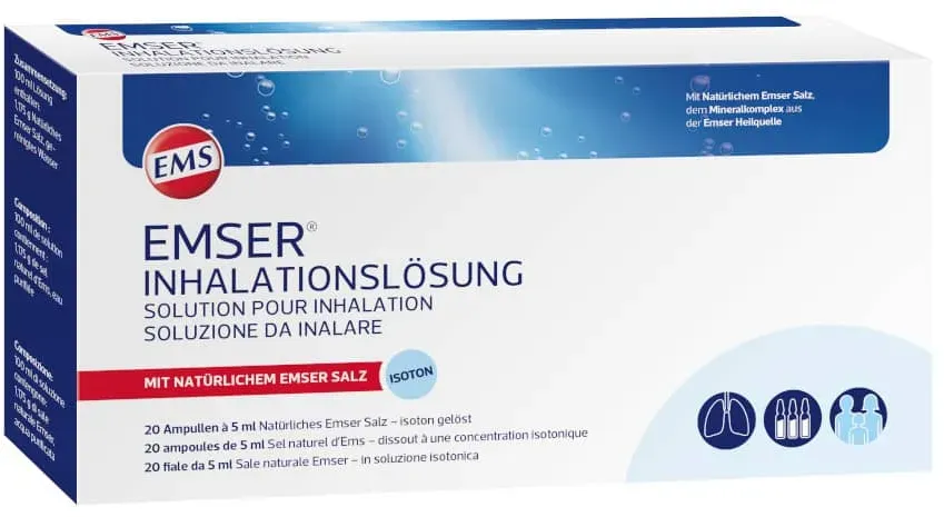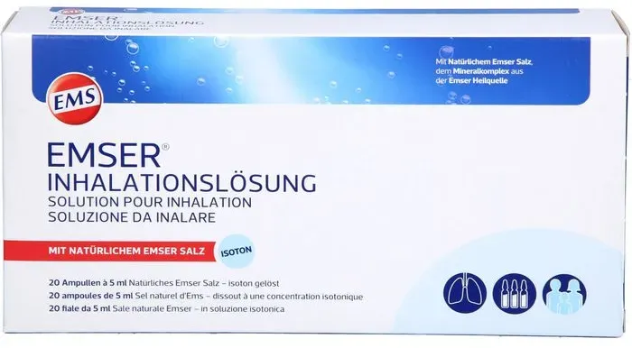 EAN: 4150168518230 - EMSER Inhalationslösung hyperton 4 % Natürliches Emser Salz - hyperton gelöst. 100% natürliche Wirkweise Verflüssigt zähen Schleim Unterstützt die Selbstreinigung der Atemwege Zur sanften Steigerung der Sekretmobilisation Natürliches Emser Salz besteht aus mehr als 30 Mineralstoffen und Spurenelementen, die das Salz charakterisieren. Neben Natrium- und Chlorid-Ionen sind Mineralstoffe wie Kalium, Calcium, Magnesium, Eisen, Fluorid und Sulfat enthalten. Den größten Anteil machen Hydrogencarbonat-Ionen aus, weshalb eine Lösung des Natürlichen Emser Salzes leicht alkalisch (pH 8-10) ist. Anwendungsgebiete Erkrankungen der unteren Atemwege, die mit Schleimverfestigung einhergehen und eine sanfte Steigerung der Sekretmobilisation erfordern Akuter Bronchitis Akuter Bronchiolitis Mukoviszidose (zystische Fibrose) - bei aponeo.de - aus Yadore Produktdaten ![]() Emser Inhalationslösung hyperton 4% 20x5 ml Inhalationsampullen