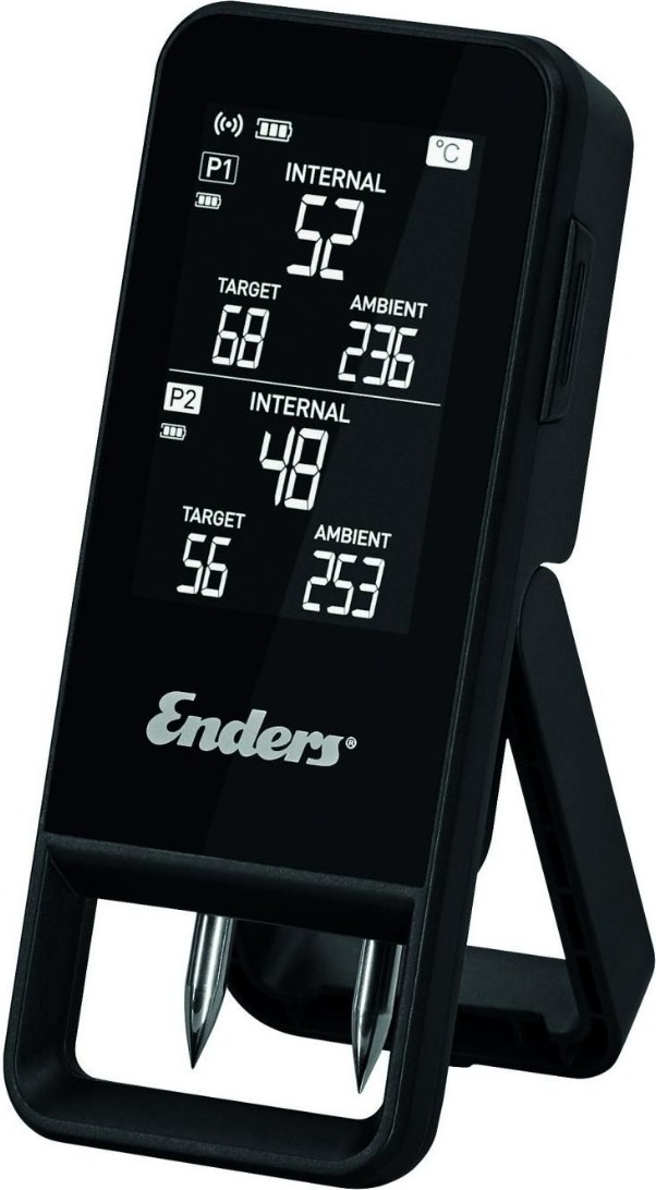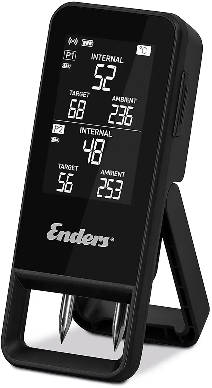 Kategorie: Grillzubehör - Enders - GTIN:4000591014147 - Das kabellose und präzise Celsio II Bluetooth-Thermometer überwacht mit seinen zwei Edelstahlfühlern die Temperaturen auf deinem Grill - sowohl die aktuell gemessene Kerntemperatur des Grillguts als auch die Umgebungstemperatur. Im Blick behältst du diese entweder direkt auf dem Always-On LCD-Display oder bequem in der Enders App auf deinem Smart-Gerät. Und das ist noch nicht alles, deine gewünschte Zielkerntemperatur, die übrigens auch angezeigt wird, wählst du in der App direkt aus der Garstufenbibliothek aus. Diese enthält empfohlene Temperaturen für die verschiedenen Garstufen zahlreicher Fleischsorten und Fischarten. Zudem speichert die App die Informationen deiner vergangenen Grillsessions, sodass du die Temperaturverläufe jederzeit in der History nachverfolgen und deine nächsten Grillerlebnisse noch präziser gestalten kannst. So verpasst du rt nie wieder den perfekten Garpunkt. - Abmessungen: 15,1 cm x 6,1 cm x 2,7 cm - Datenübermittlung: Bluetooth 5.4 - App-Konnektivität: IOS+Android - Anzeige Thermometer: LCD Display - 2 kabellose Temperaturfühler - Material Temperaturfühler: Edelstahl und Keramik - Kerntemperaturmessung bis 100 C - Umgebungstemperaturmessung bis 300 C - Länge Fühler: 125 mm - Breite Fühler (Einstechbereich): 5,5 mm - Reichweite Fühler - Thermometer: bis zu 90 m - Reichweite Thermometer - App: bis zu 80m - Betriebsdauer Fühler: bis zu 72 Stunden - Betriebsdauer Thermometer: bis zu 100 ... ![]() ![]()