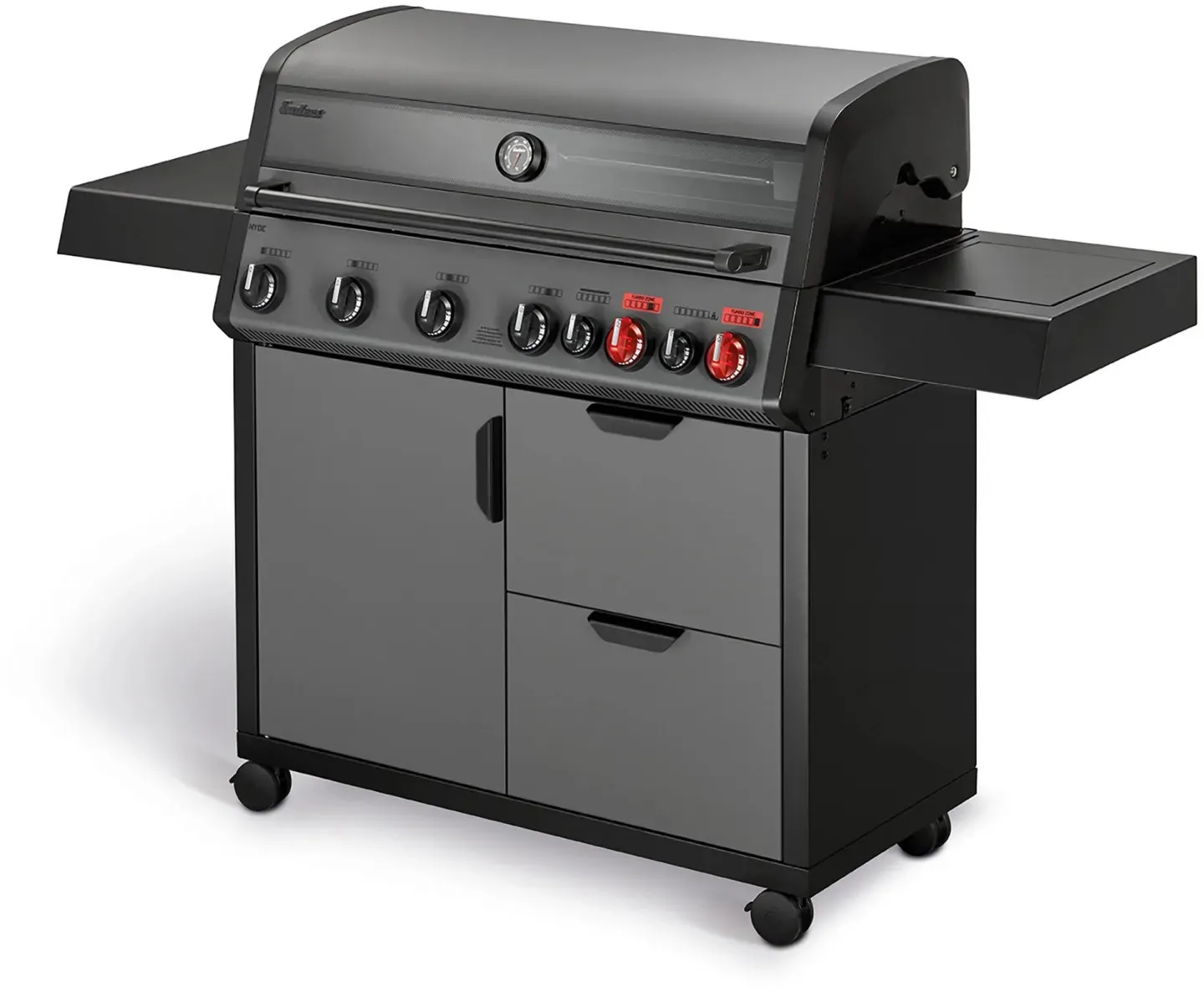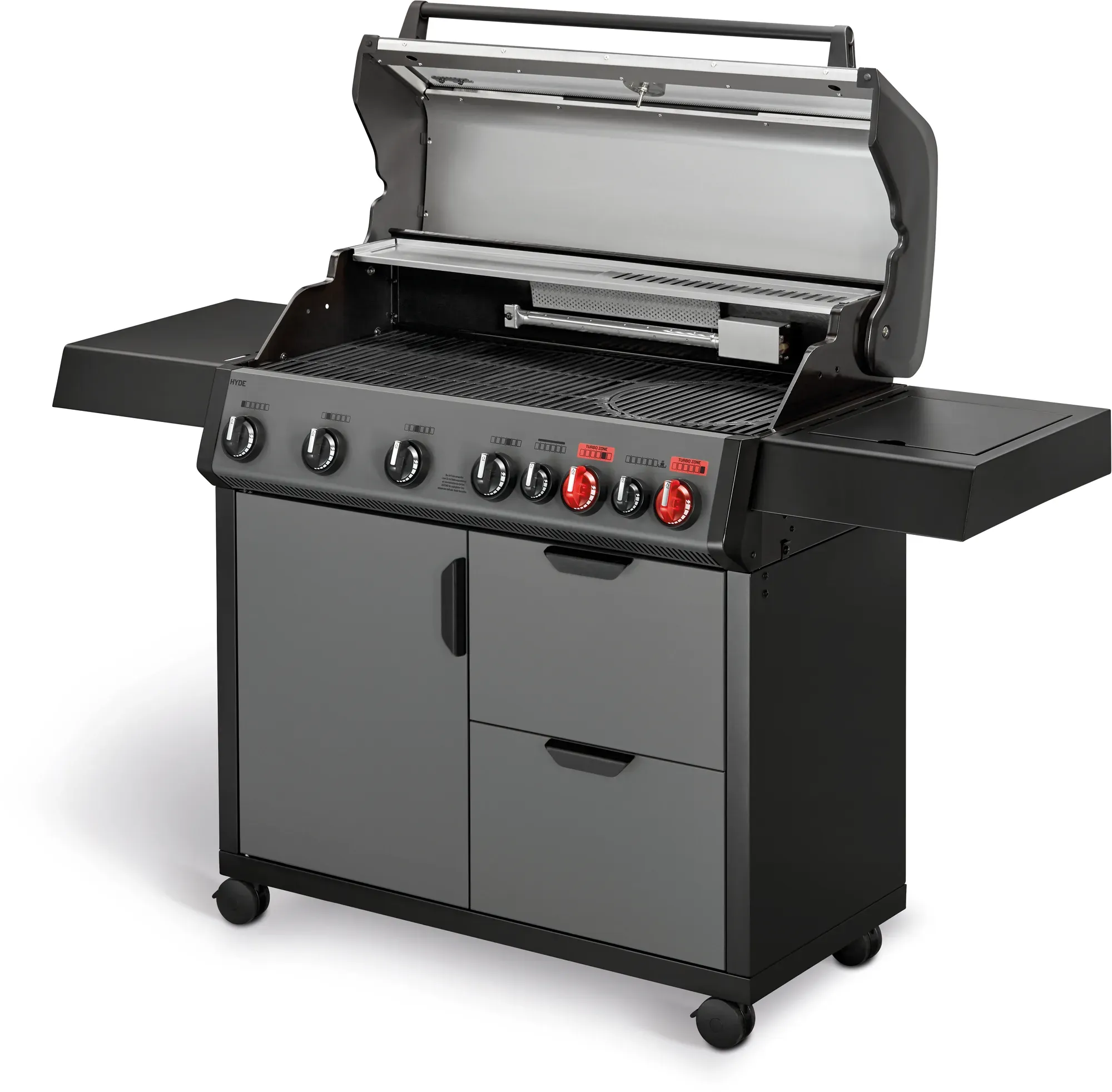 Enders - EAN: 4000591016028 - Mit dem Enders Gasgrill Hyde 6 SIKR Turbo erleben Sie Grillpower auf höchstem Niveau. Dieser Hochleistungs-Gasgrill ist perfekt für alle, die auch bei größeren Grillpartys nichts dem Zufall überlassen wollen. Ausgestattet mit zwei 800 C TURBO ZONEN und sechs Edelstahlbrennern, bietet der Hyde 6 alles, was Sie für direktes und indirektes Grillen benötigen. Dank der innovativen Technologien und des großzügigen Stauraums ist dieser Gasgrill ein Muss für ambitionierte Grillmeister. Produkt-Highlights auf einen Blick 2x 800 C TURBO ZONEN (je 4,0 kW): Turbo-heiß für das perfekte, scharfe Anbraten. Mit der Infrarot-Mesh-Technologie erreichen Sie in kürzester Zeit extreme Temperaturen, ideal für die Zubereitung von Steaks.SWITCH GRID Gussrost: Der emaillierte Gussrost sorgt für eine gleichmäßige Hitzeverteilung und bietet flexible Grillmöglichkeiten. Perfekt für Fleisch, Fisch und Gemüse.Infrarot-Backburner (3,5 kW): Stufenlos regulierbar, sorgt der Backburner für saftiges Fleisch vom Spieß und knusprige Haut Grillgenuss pur.6 stufenlos regulierbare Edelstahlbrenner (20 kW): Ermöglichen sowohl direktes als auch indirektes Grillen und Backen ideal für jede Zubereitungsart.Seitenkocher (2,9 kW): Praktisch für die Zubereitung von Beilagen oder Saucen, während das Hauptgericht auf dem Grill liegt.Sichtfenster: Kontrollieren Sie Ihr Grillgut jederzeit, ohne die Haube zu öffnen und Wärme entweichen zu lassen.Unterschrank mit zwei Schubladen und Schrank: ... ![]() ![]() Enders Hyde 6 SIKR Turbo II Gasgrill 50 mbar
