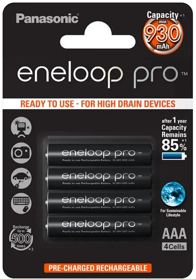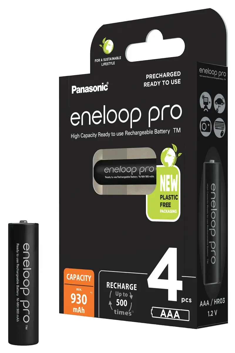 Stromversorgung Akkus NiMh-Akkus Ready-To-Use Zellen Elektronik und elektronische Komponenten - EAN:5410853064244 - eneloop pro für den vielfältigen professionellen Einsatz!Der wiederaufladbare Akku eignet sich hervorragend für Geräte, die viel Energie verbrauchen, z.B. Fotoapparate, Blitzgeräte, drahtlose Tastaturen und Mäuse, Computerspielkonsolen, Haushaltsgeräte, Radios und noch vieles mehr. eneloop Akkus sind bereits beim Kauf vollständig aufgeladen.Der große Vorteil ist, dass sie beim Kauf bereits vollständig aufgeladen sind, und zwar mit Solarenergie. Dies trägt zum eigentlichen Ziel von eneloop bei: einen nachhaltigen Lebensstil. eneloop pro darf in keiner professionellen Umgebung fehlen. Mit diesem Akkutyp können Sie nicht nur länger, sondern auch schneller arbeiten. Die eneloop pro Akkus können bis zu 500 mal aufgeladen werden und besitzen nach einem Jahr noch immer 85% ihrer ursprünglichen Kapazität. Außerdem ist die Leistung von eneloop pro Akkus stabil, was beim Einsatz von eneloop in Fotoapparaten eine schnelle Blitzfolge ermöglicht. Mit diesem Akkutyp können Sie bis zu 800 Blitze auslösen. Das allerwichtigste Merkmal von eneloop pro Akkus ist die geringe Selbstentladung. Außerdem funktionieren die Akkus auch bei extrem niedrigen Temperaturen von bis zu -20°C hervorragend.mit Solarenergie vollständig aufgeladenbis zu 500 mal aufladbargeringe Selbstentladungfunktionieren auch bei extrem niedrigen Temperaturen von bis zu -20°C hervorragendperfekte Wahl für ... Ein Standard 4er-Pack, das eine gute Leistung und Zuverlässigkeit verspricht. ![]() ![]() Panasonic eneloop pro, Ready-to-Use Ni-MH Akku, AAA Micro, 4er Pack, min. 930 mAh, 500 Ladezyklen, mit extrastarker Leistung und geringer Selbstentladung, wiederaufladbare Akku Batterie