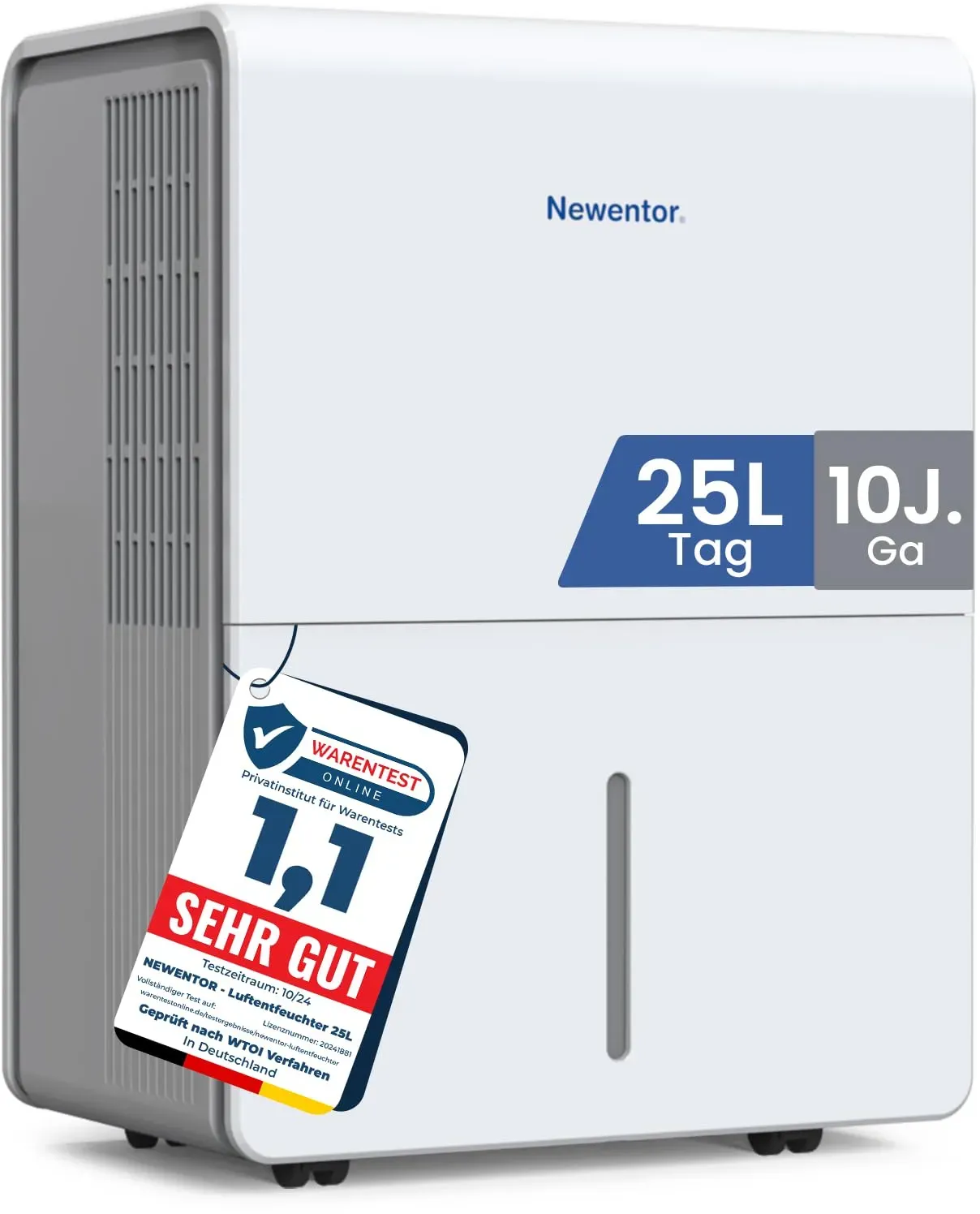 Kategorie: Luftentfeuchter - Newentor - 10J. Ga., kein leeres Versprechen! Bei unserem Newentor Luftentfeuchter erhalten Sie nicht nur eine 10J. Ga., sondern zusätzlich 'Rep. statt Aust.' weil wir von unserer Qualität überzeugt sind! Keine Warteschleifen, keine Ausreden. Feuchtigkeit? Wird ruckzuck erledigt! Newentor Luftentfeuchter Packt große Räume bis 80m2 /215m3 an und saugt die Luft richtig trocken: Labortests zeigen, wie Entfeuchter elektrisch die Luftfeuchtigkeit in nur 1 Stunde von klammen 90% auf angenehme 50% senkt (bei 30 C, in 5x7 Raum), sammelt dabei bis zu 25 Liter täglich (50 volle 0,5L-Flaschen), bei 32 C/90% Luftfeuchtigkeit noch beeindruckende 28 Liter pro Tag sammelt! Läuft superleise, stör dich nicht dran. Genieße die trockene Luft in Ruhe! Im komfortablen Betriebsmodus arbeitet der Raumentfeuchter mit nur 45 dB, leiser als normales Gesprächsflüstern, perfekt fürs Schlafzimmer, Homeoffice oder wenn du einfach deine Ruhe willst. Frische Luft, weniger Stromkosten - ein echtes Sparwunder! Im Vergleich zu anderen Geräten verbraucht dieser Luftentfeuchter elektrisch 15,5% weniger Energie. Selbst wenn es 12 Stunden durchläuft, kostet dich das nur etwa 3,6 kWh. Mehr Komfort, weniger Rechnung! Misst supergenau und spart dabei Strom. 95% aller Standard-Entfeuchter elektrisch haben ungenaue Feuchtigkeitssensoren das führt zum nervigen Dauerzyklus von Starten/Stoppen, hohem Stromverbrauch und klapperndem ärger! Newentor Raumentfeuchter löst das mit einem ... Dieser smarte Luftentfeuchter lässt sich per App steuern und bietet eine hohe Entfeuchtungsleistung für größere Bereiche. Manomano.d e