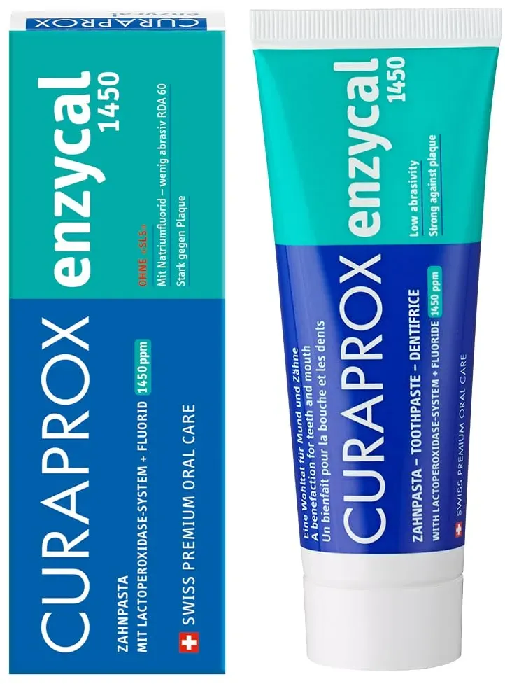 Auf Lager Versand durch AmazonCuraprox Enzycal 950 Zahnpasta ? Milde Fluorid-zahnpasta Mit Enzymen Für Die Sanfte Tägliche Mundpflege | Wenig Abrasiv, Frischer Geschmack, SLS-frei, 75 Ml | Hergestellt in Der Schweiz
