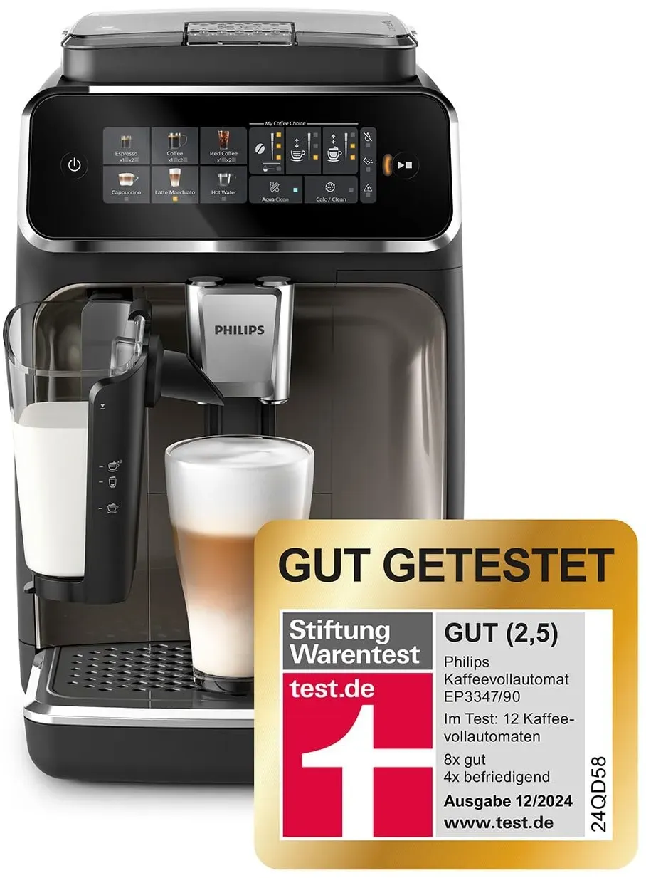 Zustand: Neu - Kaffeevollautomaten - Philips - EP3347/90 - EAN: 8720389027673 EAN: 8720389030222 - SAMTIG-CREMIGER MILCHSCHAUM: Die LatteGo bereitet automatisch samtig-cremigen Milchschaum für Ihren Milchkaffee mit verschiedenen Milchsorten zu. EINFACHE KAFFEEAUSWAHL: Dank des modernen Touchscreen-Displays mit farbigen Symbolen können Sie Ihre Lieblingsgetränke ganz einfach auswählen. EINFACHE ANPASSUNG: Mit der My Coffee Choice-Funktion können Sie Ihren Kaffee ganz nach Ihrem Geschmack zubereiten: Wählen Sie Ihre bevorzugte Kaffeestärke, Größe und Milchschaummenge. SILENTBREW: Leise Zubereitung von aromatischem Kaffee mit unserer branchenführenden SilentBrew-Technologie AQUACLEAN FILTER: Wenn Sie den Filter nach Aufforderung durch die Maschine wechseln, brauchen Sie Ihre Maschine bis zu 5000 Tassen*** lang nicht zu entkalken und können Ihren Kaffee mit klarem und gereinigtem Wasser genießen. LANGLEBIGES KERAMIKMAHLWERK: Bringen Sie den vollen Geschmack Ihres Kaffees mit unserem strapazierfähigen Keramikmahlwerk zur Geltung. Das langlebige Keramikmahlwerk kann in 12 Stufen von fein bis grob eingestellt werden. - bei Amazon.de Saturn Online Shop listet das Gerät ebenfalls für 379 Euro, was eine weitere gute Option im unteren Preissegment ist. ![]() ![]() PHILIPS EP3347/90 Serie 3300 LatteGo 5 Kaffeespezialitäten Kaffeevollautomat Matt-Schwarz, Silber-lackierte Arena, Edelstahl Abtropfschale