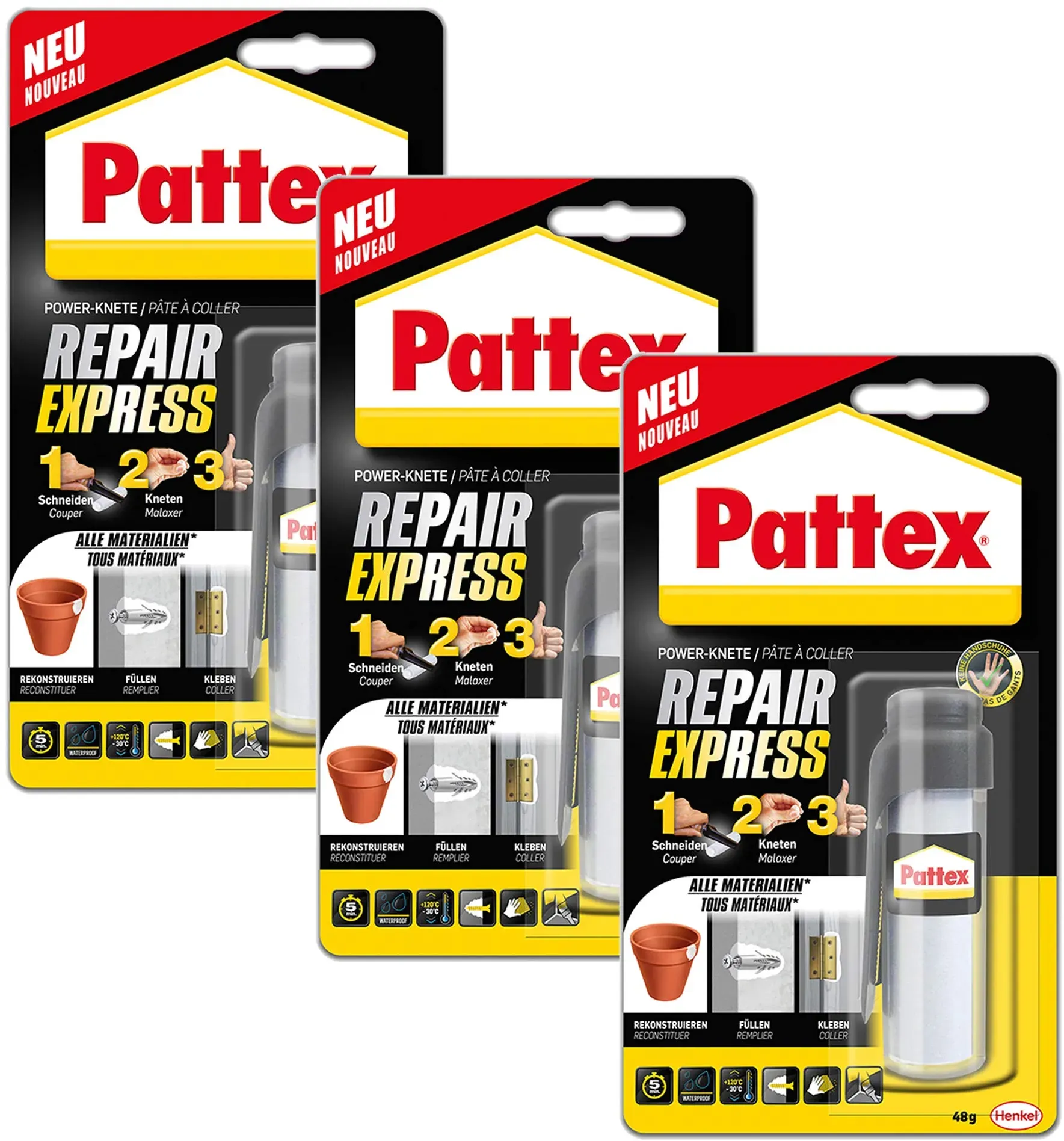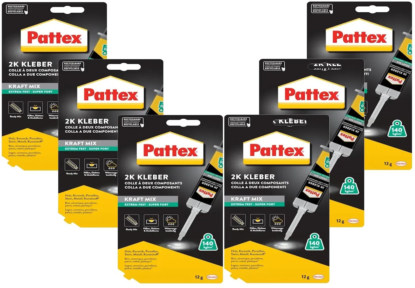 Kategorie: Klebeprodukte - Pattex - GTIN:4015000497619 - Pattex Powerknete Repair Express, Modelliermasse zum Kleben & Reparieren, Epoxidharz Kleber für viele Materialien, lackier- und schleifbare Knete (3x Repair Express Stic Universal) - 34,00 Euro bei Amazon Marketplace Automotive - gefunden von billiger.de Pattex Kraft-Mix Extrem Fest ist eine transparente Knete mit hoher Endfestigkeit für anspruchsvolle Verklebungen. ![]() ![]() Pattex Kraft-Mix Extrem Fest, extrem starker Epoxidharz Kleber mit hoher Endfestigkeit, Modelliermasse für fast jedes Material, transparente Knete, 6x12g