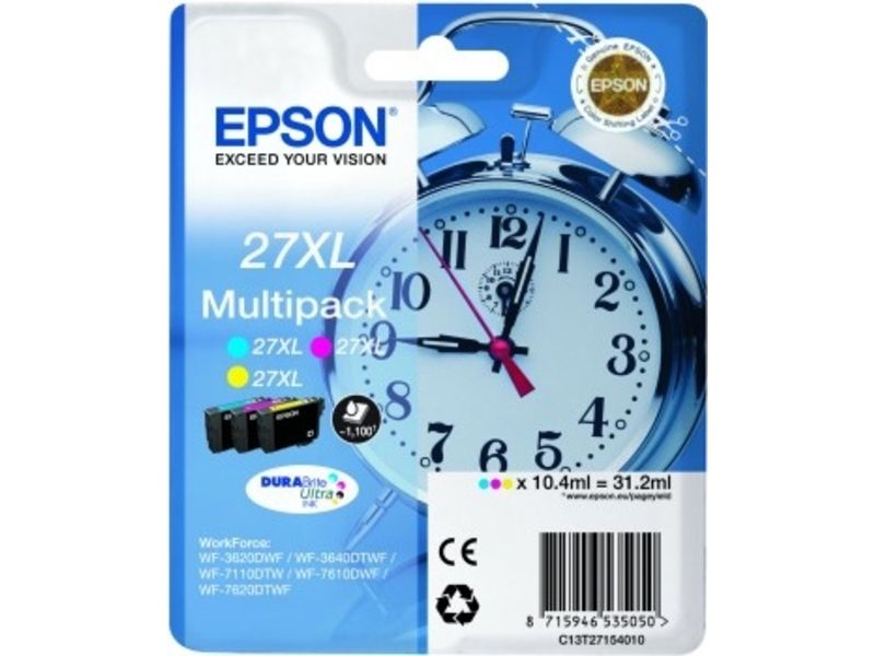 Auf Lager Versand durch AmazonEpson Original 27XL Tinte Wecker (WF-3620DWF, WF-3640DTWF, WF-7110DTW, WF-7210DTW, WF-7610DWF, WF-7620DTWF, WF-7710DWF, WF-7715DWF, WF-7720DTWF), Multipack 3-farbig