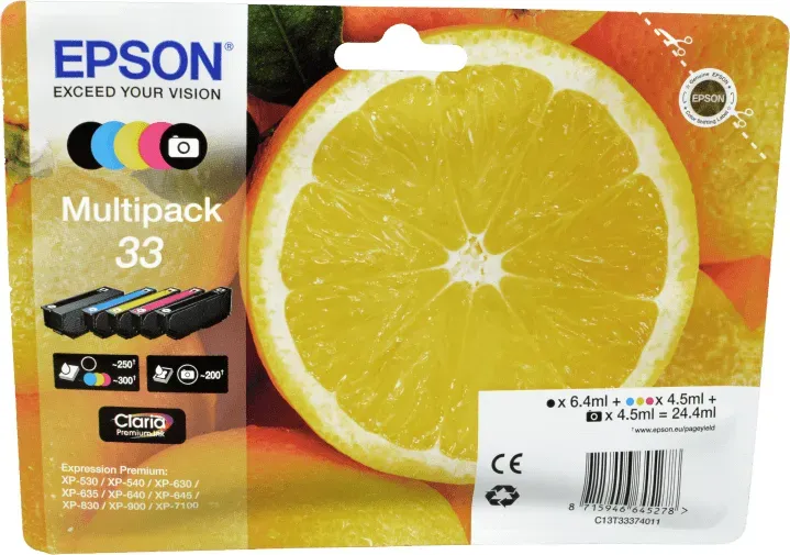 Verfügbarkeit: Auf Lager, Lieferung in 1-3 Werktagen - Kategorie: Druckerpatronen - Epson - GTIN:8715946645278 - Epson Multipack 5-colours 33 Claria Premium Ink BK / PBK / C / M / YEpson Claria Premium Ink - für herausragende AusdruckeDie Epson Claria Premium Ink - 76,00 Euro bei TECHNIKdirekt - gefunden von billiger.de Dieses 5er-Set Original Epson Patronen bietet eine gute Balance aus Preis und Leistung für Standardnutzer. Bueroplus. de EPSON 33 / T3337 schwarz, cyan, magenta, gelb, Foto schwarz Druckerpatronen, 5er-Set