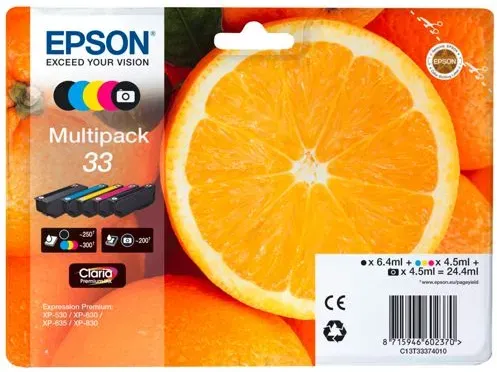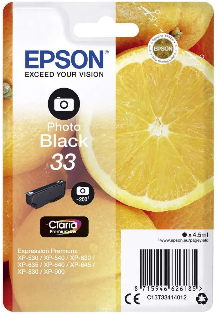 56 Händlerangebote bei billiger.de - Kategorie: Druckerpatronen - Epson - 4.5ml für ca. 200 Fotos C13T33414010 - kompatibel mit XP-530, XP-630, XP-635, XP-830, XP-540, XP-640, XP-645, XP-900 - GTIN:8715946600499 Diese einzelne Original Epson Fotopatrone in Schwarz ist perfekt für Nutzer, die nur eine spezifische Farbe benötigen und Wert auf Originalqualität legen. ![]() ![]() Epson Original Orangen Claria 33 Tintenpatrone Photo Schwarz €“ 1 x 6,4 ml €“ Original Epson Tintenpatronen für optimale Druckergebnisse
