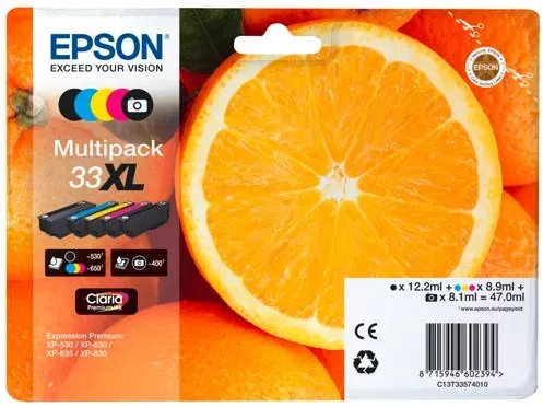Tinte Original Inkjet-Kartuschen - EAN:8715946645292 - Eine Top-Qualität, hierfür sorgt das Original von EPSON - mit den EPSON 33XL / T3357XL schwarz, cyan, magenta, gelb, Foto schwarz Druckerpatronen, 5er-Set gehen Sie keine Kompromisse ein!Lesen Sie jetzt mehr zu den EPSON 33XL / T3357XL schwarz, cyan, magenta, gelb, Foto schwarz Druckerpatronen, 5er-Set!Eine Technologie, die überzeugt: Claria Premium InkDas Produkt ist mit der Claria Premium Ink-Technologie von EPSON ausgestattet. Die Vorteile sprechen für sich: Auf Grund von Einzelpatronen ist das Produkt sehr kosteneffizient, es muss immer nur die aufgebrauchte Farbe ersetzt werden. Die EPSON 33XL / T3357XL schwarz, cyan, magenta, gelb, Foto schwarz Druckerpatronen wurde speziell für EPSON-Geräte konzipiert, wodurch gestochen scharfe Ausdrucke entstehen, die wisch- und wasesrfest sind. Eine Vielzahl von Ausdrucken mit den EPSON 33XL / T3357XL schwarz, cyan, magenta, gelb, Foto schwarz Druckerpatronen, 5er-SetBeim Kauf stellt sich natürlich die Frage, wie lange Sie mit dem Produkt auskommen können. Die Angaben zur Füllmenge sind hierfür besonders interessant. Das Produkt ist mit einer Füllmenge von ca. 1x 12,2, 3x 8,9, 1x 8,1 ml ausgestattet.Perfekt auf Ihr Gerät abgestimmtDer Artikel stammt aus dem Hause EPSON. Das Unternehmen begeistert unter anderem durch hochwertige Druckergebnisse bei gleichbleibend hoher Qualität. Bei diesem Artikel können Sie beruhigt zugreifen, denn Sie erwerben ein Produkt der Original-Marke. ... Dieses Original Epson Multipack in XL-Größe bietet alle benötigten Farben in hoher Kapazität für anspruchsvolle Nutzer. ![]() ![]() Epson Multipack Claria Premium BK/PBK/C/M/Y 33 XL T 3357