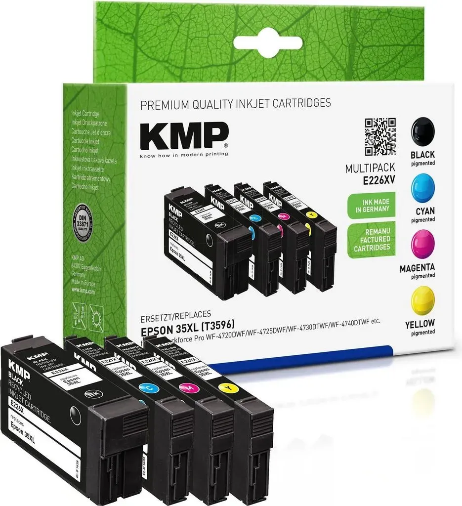 Verfügbarkeit: Auf Lager - Kategorie: Druckerpatronen - Double D - ÂProduktbeschreibung : DOUBLE D 35XL Multipack für Epson 35XL Ersatz für Epson WF 4720 Druckerpatronen, Epson WF 4725 Druckerpatronen ÂKompatibel mit: Epson WorkForce Pro WF-4720DWF, WF-4725DWF, WF-4730DTWF, WF-4740DTWF ÂSeitenanzahl: 2600 Seiten für Schwarz Patrone, 1900 Seiten für Farbe Patrone ÂPackungsinhalt : 2* 35XL Schwarz, 2* 35XL Cyan, 2* 35XL Magenta, 2* 35XL Gelb ÂDouble D 35XL Druckerpatronen für Epson 35XL: Einfach zu installieren und zu verwenden, die gedruckten Schriften hell und klar, die Patrone vakuum verpackt und die Tinte nicht leicht auslaufen - 22,99 Euro bei Amazon Marketplace CE - gefunden von billiger.de Dieses kompatible CMYK-Set von KMP ist eine gute Mittelklasse-Option für Nutzer, die eine ausgewogene Leistung und einen fairen Preis suchen. ![]() ![]() KMP E226XV kompatibel zu Epson 35XL CMYK