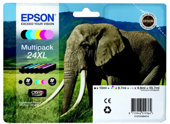 EAN: 8715946615158 - Epson C13T24384011 - 24XL Tintenpatrone MultiPack Bk,C,M,Y,LC,LM, 740 Seiten 500pg + 5x740 pg, 1x10ml + 3x9ml + 2x10ml VE=6 für Epson XP 750 - bei tintencenter.com - aus Yadore Produktdaten Ein Original Epson Multipack zu einem fairen Preis, das die beliebte "Elefant"-Serie umfasst. ![]() ![]() Original Epson - 24XL, Elephant eBay Multipack Tintenpatrone, T2438, C13T24384011