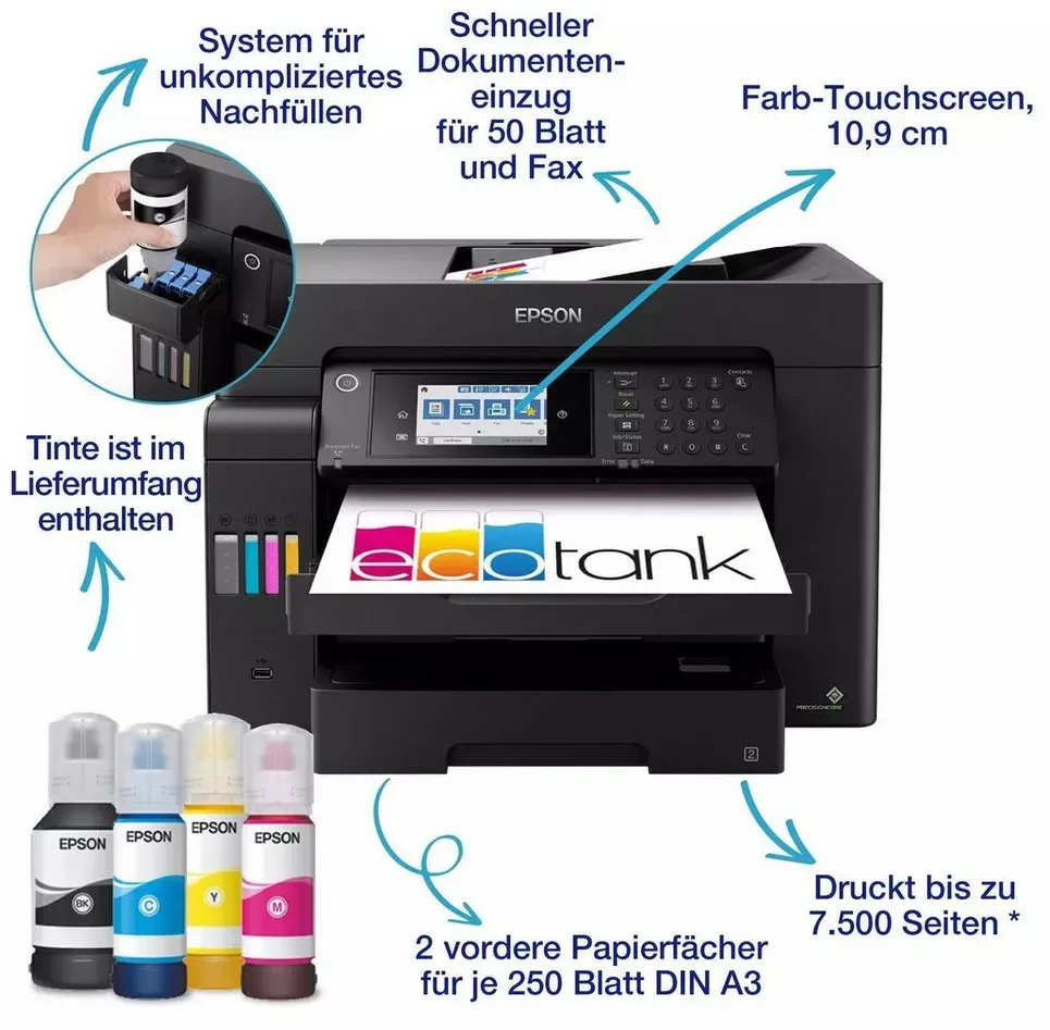 Kategorie: Multifunktionsdrucker - Epson - GTIN:8715946734583 - SCHNELLER, ZEITSPARENDER DRUCK - Drucken Sie mit Geschwindigkeiten von bis zu 25 Seiten/Min.* und eine erste Seite in nur 51 2 Sekunden* A3-MULTIFUNK-DRUCKER M. FAX, TOUCHSCREEN & AUTO. DOK.-EINZUG - Hochwertiges Drucken, Kopieren, Scannen und Faxen in einem Gerät, plus große Papierfächer, um Ihnen Zeit zu sparen MEHRERE ANSCHLUSSOPTIONEN FüR EINFACHE DRUCKVORGäNGE - Mit Wi-Fi, Wi-Fi Direct, Ethernet und kostenlosen mobilen Druck-Apps*. Drucken Sie Ihre Dokumente mit der Epson Smart Panel-App* direkt von Ihrem smarten Gerät. EIN SET ERSATZTINTEN DRUCKT BIS ZU 7.500 SEITEN IN SCHWARZWEISS UND 6.000 SEITEN IN FARBE* - Fügen Sie einfach Papier hinzu, um mit wenig Aufwand zu drucken! NUMMER 1 UNTER DEN TINTENTANKDRUCKERN WELTWEIT* - 100 Millionen verkaufte EcoTank-Drucker weltweit* - 994,95 Euro bei Amazon Marketplace Automotive - gefunden von billiger.de Coolblue bietet den Epson EcoTank ET-16605 inklusive einem Satz Reservetinte für 1023 Euro an, was ein gutes Gesamtpaket darstellt. ![]() ![]() Epson EcoTank ET-16605 + 1 Satz Reservetinte