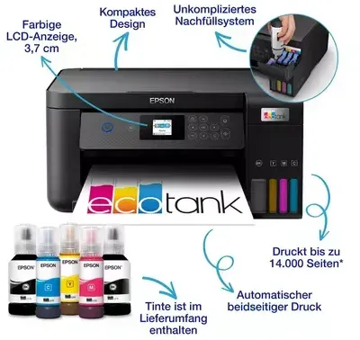 Verfügbarkeit: 1-3 Werktage - Kategorie: Multifunktionsdrucker - Epson - GTIN:8715946686394 - Epson EcoTank ET-2851 Multifunktionsdrucker €“ Der ideale Druckpartner für ZuhauseEntdecken Sie den Epson EcoTank ET-2851, einen innovativen Multifunktions-Wi-Fi-Tintentankdrucker, der durch seine großen Tintentanks und benutzerfreundlichen Features überzeugt. Mit diesem Drucker haben Sie alles, was Sie für das Drucken, Scannen und Kopieren benötigen, direkt in Ihrem Zuhause zur Hand.Hohe Kapazität und kosteneffizientes DruckenDer Epson EcoTank ET-2851 ist speziell für Anwender konzipiert, die häufig drucken. Die großvolumigen Tintentanks ermöglichen ein unkompliziertes Nachfüllen. Im Lieferumfang ist bereits eine zusätzliche Tintenflasche in Schwarz enthalten, die für einen Tintenvorrat von bis zu n reicht. Ein Satz Tintenflaschen ermöglicht das Drucken von bis zu 14.000 Seiten in Schwarzweiß und 5.200 Seiten in Farbe, sodass Sie nicht ständig an den Tintenwechsel denken müssen.Moderne Konnektivität für flexibles DruckenDank der vollständigen Konnektivität über WLAN und Wi-Fi Direct können Sie den Epson EcoTank ET-2851 mühelos in Ihr bestehendes Heimnetzwerk integrieren. Drucken Sie bequem von Ihrem Smartphone, Tablet oder Laptop, ohne an ein Kabel gebunden zu sein. Die Epson Smart Panel-App ermöglicht zusätzlich die Bedienung Ihres Druckers über Ihr mobiles Gerät, was Ihnen noch mehr Flexibilität verleiht.Intelligente Features für hervorragende ... Dieses Angebot für 316 Euro von Boomstore bietet einen All-in-One-Tintenstrahldrucker mit hoher Auflösung, was für Nutzer mit höheren Ansprüchen an die Druckqualität interessant ist. ![]() ![]() Epson All in One A4 Tintenstrahl Drucker 4800 x 1200 DPI EcoTank ET-2851