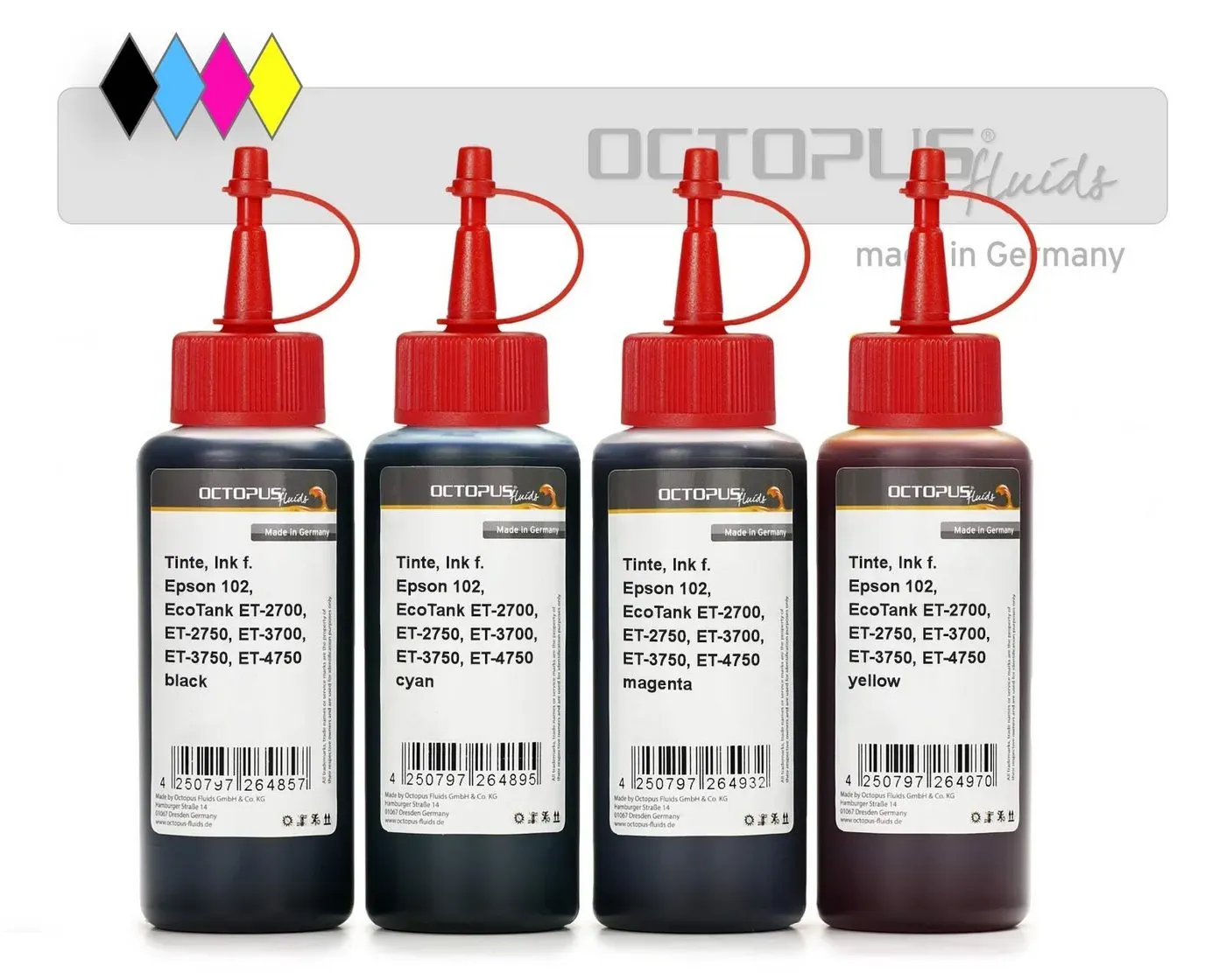 Verfügbarkeit: Auf Lager - Kategorie: Druckerpatronen - InkPro - GTIN:4250544244972 - œ 490 ml Nachfülltinte Black, Cyan, Magenta, Yellow kompatibel mit Epson Ecotank 102 œ 280 ml Black und je 70 ml Cyan, Magenta und Yellow œ kompatibel mit Epson EcoTank ET-15000, ET-2700, ET-2750, ET-2751, ET-2756, ET-2850, ET-2851, ET-2856, ET-3700, ET-3750, ET-3850, ET-4750, ET-4850, ET-4856 œ In speziellen Nachfüllflaschen mit Adapter, direkt passend auf die Tanks der Drucker! - 17,99 Euro bei Amazon Marketplace CE - gefunden von billiger.de Dieses Nachfülltintenset bietet eine große Menge an Tinte in allen Farben und ist eine gute Wahl für Nutzer, die ihre Tinte selbst nachfüllen möchten. ![]() ![]() OCTOPUS Fluids Tinte komp. mit Epson 102 EcoTank ET-2700, ET-2750 CMYK 4x 100ml Nachfülltinte (für Epson, Set, 4x 1000 ml)