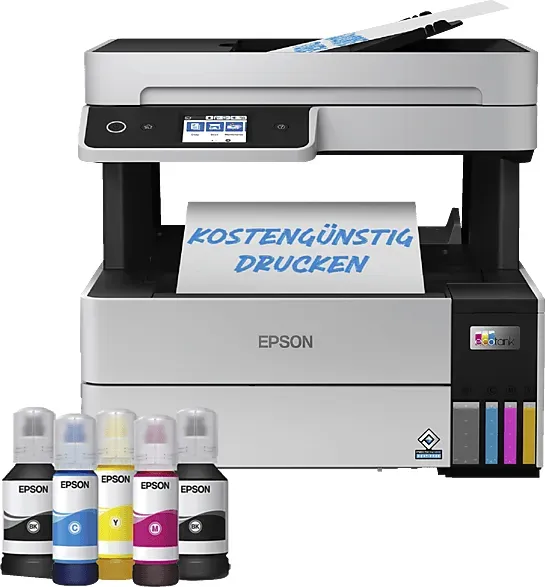 Kategorie: Multifunktionsdrucker - Epson - GTIN:8715946689821 - Effizienz neu definiert Für mehr Produktivität in Ihrem Homeoffice: Dieser ultraschnelle und effiziente Drucker druckt die erste Seite in nur 7 Sekunden*. DIN A4 EcoTank-Drucker mit vielen Funktionen Drucken, kopieren und scannen Sie mit dem EcoTank ET-5150, der beidseitigen Druck, ein vorderes Papierfach für 250 Blatt und einen automatischen Dokumenteneinzug für 35 Blatt bietet. Sämtliche Funktionen können Sie einfach und bequem über den 6,1 cm großen LCD-Touchscreen auswählen und ausführen. Weiter sparen Mit diesem EcoTank sparen Sie Zeit und profitieren gleichzeitig von besonders niedrigen Seitenkosten. Im Gegensatz zu anderen Druckern verfügt der EcoTank über große Tintentanks, die mit kostengünstigen Tintenflaschen nachgefüllt werden. Druck in professioneller Qualität Die EcoTank 113-Tintenserie bietet Pigmenttinten für wisch-, wasser- und textmarkerfeste Ausdrucke. Mit den im Lieferumfang enthaltenen Tintenflaschen können Sie bis zu 13.300 Seiten in Schwarzweiß und 5.200 Seiten in Farbe drucken*. Standortunabhängig drucken Per WLAN und Wi-Fi Direct können Sie Dateien von Ihren Smart-Geräten bequem mit der iPrint- und der Smart-Panel-App von Epson drucken*. Verfügt auch über Ethernet. Einfach in der Bedienung und zuverlässig Mit den wiederverschließbaren, sicheren und sauberen Tintenflaschen ist das Nachfüllen des Tintentanks ein Kinderspiel. Der PrecisionCore-Druckkopf mit einzigartiger Heat-Free ... Media Markt bietet den Epson EcoTank ET-5150 zu einem fairen Preis an, inklusive Tinte, ADF, Duplex und WiFi. ![]() ![]() EPSON EcoTank ET-5150 - nachfüllbarer 3-in-1 Tintentankdrucker inkl. Tinte, ADF, Duplex, WiFi, netzwerkfähig Multifunktionsdrucker